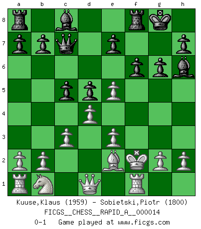Last move : 0-1 2007 March 23 14:6:56 [Event "FICGS__CHESS__RAPID_A__000014"] [Site "FICGS"] [Date "2007.02.14"] [Round "1"] [White "Kuuse,Klaus"] [Black "Sobietski,Piotr"] [Result "0-1"] [WhiteElo "1959"] [BlackElo "1800"] 1.f4 d5 2.Nf3 g6 3.e3 Bg7 4.Be2 Nf6 5.O-O O-O 6.d4 c5 7.c3 Nc6 8.Ne5 Qc7 9.Bd2 Ne4 10.Be1 Nxe5 11.fxe5 Bh6 12.Bf2 Nxf2 13.Kxf2 f6 0-1 Bird's Opening Kingside Castling by player White (move 5) Kingside Castling by player Black (move 5) Player Black won this chess game. Follow this game move after move (download)Morphy was probably the greatest genius of them all. (Bobby Fischer) Wenn ich gewinne bin ich ein Genie. Wenn nicht, dann bin ich keines. (Robert James Fischer) Ayuda a tus piezas para que ellas te puedan ayudar. (Paul Morphy) On croit qu'il y a plus de mauvais joueurs que de bons joueurs, c'est faux : Il y a autant de joueurs qui gagnent que de joueurs qui perdent. (Philippe Geluck) Either move or be moved. (Ezra Pound)