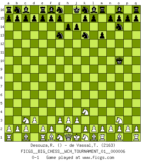 Last move : 0-1 2014 April 16 19:54:11 [Event "FICGS__BIG_CHESS__WCH_TOURNAMENT_01__000006"] [Site "FICGS"] [Date "2014.03.03"] [Round "1"] [White "Desouza,Romeo"] [Black "de Vassal,Thibault"] [Result "0-1"] [WhiteElo ""] [BlackElo "2163"] 1.j2-k4 h15-g13 2.b1-c3 j15-k13 3.p1-o3 h16-o10 4.g2-g3 m15-m13 5.d2-d3 p16-o14 0-1 This big chess game has been lost on time (started : 2014.03.03 19:34:3) Follow this game move after move (download)You know, comrade Pachman, I don't enjoy being a Minister, I would rather play Chess like you. (Che Guevara) Wie, soll nun auch die Opposition abgeschafft werden? Ja, es tut mir leid, Ihnen diesen Schmerz nicht ersparen zu können. (Aaron Nimzowitsch) No hay precio que sea tan grande por la cabellera del Rey enemigo. (Koblentz) Il s'avisa de me proposer d'apprendre les échecs qu'il jouait un peu... me voilà forcené des échecs. J'achète un échiquier, je m'enferme dans ma chambre, j'y passe des jours et des nuits à vouloir apprendre par cur toutes les parties. (Jean-Jacques Rousseau, Confessions) Who needs drugs and alcohol if he can play Big Chess at FICGS ? (Heinz-Georg Lehnhoff)