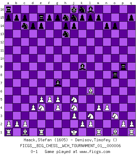Last move : 0-1 2014 June 4 22:43:24 [Event "FICGS__BIG_CHESS__WCH_TOURNAMENT_01__000006"] [Site "FICGS"] [Date "2014.03.03"] [Round "1"] [White "Haack,Stefan"] [Black "Denisov,Timofey"] [Result "0-1"] [WhiteElo "1605"] [BlackElo ""] 1.g2-g4 d15-d14 2.f2-f4 j15-h13 3.k1-l3 n15-n14 4.n2-n4 h16-o10 5.h3-h4 o10-o2 6.p1-o3 o2-g9 7.e2-e4 c16-k9 8.f4-f5 o16-h10 9.j2-k4 p16-n15 10.f1-l6 b16-c14 11.h1-p8 n15-m13 12.p8-p15 o15-o14 13.p15-p5 q16-p16 14.p5-g5 g9-g5 15.h4-g5 m13-l11 16.h2-j4 l11-j10 17.b1-c3 p16-p8 18.d2-d4 j10-k8 19.l6-m5 p8-o8 20.m2-m4 g16-j15 21.g1-h3 h10-j9 22.e4-e5 m16-p16 23.l1-p5 e15-e14 24.h3-j5 f16-e15 25.p5-e15 e16-e15 26.k4-l6 k8-l6 27.m5-l6 p16-p9 28.c3-e4 j9-g7 0-1 This big chess game has been lost on time (started : 2014.03.03 19:34:3) Follow this game move after move (download)Chess demands total concentration. (Bobby Fischer) Als ich elf wurde, wurde ich einfach gut. (Robert James Fischer) El Ajedrez demanda una total concentración. (Bobby Fischer) Les échecs, c'est la lutte contre l'erreur. (Johannes Zukertort) The smarter you play, the luckier you'll be. (Mark Pilarski)