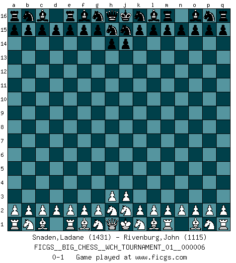 Last move : 0-1 2014 April 3 7:9:42 [Event "FICGS__BIG_CHESS__WCH_TOURNAMENT_01__000006"] [Site "FICGS"] [Date "2014.03.03"] [Round "1"] [White "Snaden,Ladane"] [Black "Rivenburg,John"] [Result "0-1"] [WhiteElo "1431"] [BlackElo "1115"] 0-1 This big chess game has been lost on time (started : 2014.03.03 19:34:3) Follow this game move after move (download)There is only one thing Fischer does in Chess without pleasure: to lose ! (Boris Spassky) Es gibt Leute, die glauben, alles wäre vernünftig, was man mit einem ernsthaften Gesicht tut. (Georg Christoph Lichtenberg) ¿Quién es tu oponente esta tarde? Esta tarde mi oponente son las piezas negras. (Akiba Rubinstein) Les Cavaliers se révèlent fort utiles dans les positions fermées. D'habitude, les Fous sont un peu plus forts que les Cavaliers dans les positions ouvertes. Qu'on le veuille ou non, il restera toujours des exceptions ! You lose, general Kenobi. (General Grievous in Star Wars ep.3)