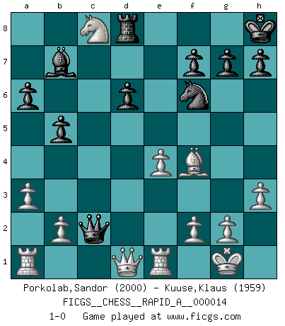 Last move : 1-0 2007 May 20 4:11:0 [Event "FICGS__CHESS__RAPID_A__000014"] [Site "FICGS"] [Date "2007.02.14"] [Round "1"] [White "Porkolab,Sandor"] [Black "Kuuse,Klaus"] [Result "1-0"] [WhiteElo "2000"] [BlackElo "1959"] 1.e4 e5 2.Nf3 Nc6 3.Bb5 a6 4.Ba4 Nf6 5.O-O Be7 6.Re1 b5 7.Bb3 d6 8.c3 O-O 9.h3 Na5 10.Bc2 c5 11.d4 Qc7 12.Nbd2 cxd4 13.cxd4 Nc6 14.a3 Nxd4 15.Nxd4 exd4 16.Nf3 Bb7 17.Nxd4 Rac8 18.Bf4 Rfd8 19.Nf5 Qxc2 20.Nxe7+ Kh8 21.Nxc8 1-0 This chess game has been lost on time (started : 2007.02.14 17:7:33) Ruy Lopez : Closed Kingside Castling by player White (move 5) Kingside Castling by player Black (move 8) Player White won this chess game. Follow this game move after move (download)Pawns are born free, yet they are everywhere in chains. (Rick Kennedy) Vom Schach wurde gesagt das Leben sei dafür nicht lange genug. Aber das ist der Fehler des Lebens, nicht des Schach'. (Irving Chernev) Aquellos que dicen entender al Ajedrez, no entienden nada. (Robert Hubner) La menace est plus forte que l'exécution. (Aaron Nimzovitch) I don't diet. I just don't eat as much as I'd like to. (Linda Evangelista, supermodel)