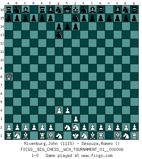 Last move : 1-0 2014 April 28 20:37:54 [Event "FICGS__BIG_CHESS__WCH_TOURNAMENT_01__000006"] [Site "FICGS"] [Date "2014.03.03"] [Round "1"] [White "Rivenburg,John"] [Black "Desouza,Romeo"] [Result "1-0"] [WhiteElo "1115"] [BlackElo ""] 1.g2-g4 h15-g13 2.h1-a8 g15-g14 3.h3-h4 1-0 This big chess game has been lost on time (started : 2014.03.03 19:34:3) Follow this game move after move (download)The tactician must know what to do whenever something needs doing; the strategist must know what to do when nothing needs doing. (Savielly Tartakover) Was ist der Unterschied zwischen einem Strassenarbeiter und einem Schachspieler? --Der Schachspieler bewegt sich ab und zu. (Anonymous) Tu no necesitas jugar muy bien, únicamente ayudar a tu oponenet a que juegue muy mal. (Genrikh Chepukaitis) Soyez une menace à chaque fois que vous vous asseyez pour jouer. (Ken Smith) The difference between stupidity and genius is that genius has its limits. (Murphy)