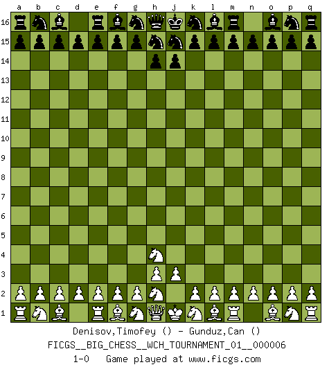 Last move : 1-0 2014 April 4 7:21:57 [Event "FICGS__BIG_CHESS__WCH_TOURNAMENT_01__000006"] [Site "FICGS"] [Date "2014.03.03"] [Round "1"] [White "Denisov,Timofey"] [Black "Gunduz,Can"] [Result "1-0"] [WhiteElo ""] [BlackElo ""] 1.j2-h4 1-0 This big chess game has been lost on time (started : 2014.03.03 19:34:3) Follow this game move after move (download)No other master has such a terrific will to win. At the board he radiates danger, and even the strongest opponents tend to freeze, like rabbits when they smell a panther. Even his weaknesses are dangerous. As white, his opening game is predictable - you can make plans against it - but so strong that your plans almost never work. In the middle game his precision and invention are fabulous, and in the end game you simply cannot beat him. (Anonymous German Expert) Wenn du nicht weißt was du tun sollst, warte bis dein Gegner eine Idee hat. Sie wird sicher schlecht sein. (Siegbert Tarrasch) La esencia del Ajedrez es pensar acerca de lo que el Ajedrez es. (David Bronstein) Aux échecs, l'amour-propre est satisfait quand on remporte la victoire, mais il n'y a pas de honte à être battu. (Benjamin Franklin) The age of a woman doesn't mean a thing. The best tunes are played on the oldest fiddles. (Ralph Waldo Emerson)