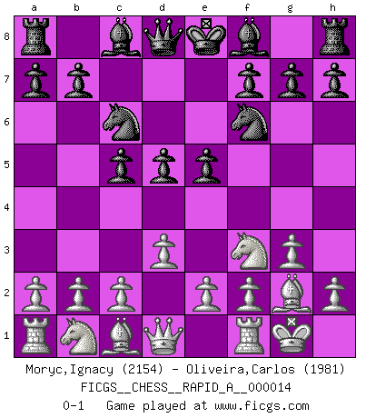 Last move : 0-1 2007 April 4 3:44:14 [Event "FICGS__CHESS__RAPID_A__000014"] [Site "FICGS"] [Date "2007.02.14"] [Round "1"] [White "Moryc,Ignacy"] [Black "Oliveira,Carlos"] [Result "0-1"] [WhiteElo "2154"] [BlackElo "1981"] 1.Nf3 d5 2.g3 Nf6 3.Bg2 c5 4.O-O Nc6 5.d3 e5 0-1 This chess game has been lost on time (started : 2007.02.14 17:7:33) Reti : King's Indian attack (Barcza system) Kingside Castling by player White (move 4) Player Black won this chess game. Follow this game move after move (download)After a bad opening, there is hope for the middle game. After a bad middle game, there is hope for the endgame. But once you are in the endgame, the moment of truth has arrived. (Edmar Mednis) Schach sollte überall auf der Welt Schulfach werden. Es fördert die geistige Auseinandersetzung. Es lehrt die Demut in der Niederlage. (Garry Kasparov) Cuando estes solo, cuando te sientas un extraño en el mundo, juega al Ajedrez. Esto levantará tu espiritu y será tu consejero de guerra. (Aristóteles) Plusieurs personnes se sont demandées comment Tal faisait pour gagner... En fait, c'est très simple ! Il met ses pièces au centre de l'échiquier et les sacrifie quelque part ! (David Bronstein) Cactus - It is depressed cucumber. (Ilmars Cirulis)