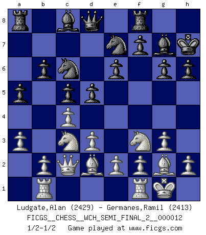 Last move : 1/2-1/2 2014 May 14 6:7:32 [Event "FICGS__CHESS__WCH_SEMI_FINAL_2__000012"] [Site "FICGS"] [Date "2014.03.05"] [Round "5"] [White "Ludgate,Alan"] [Black "Germanes,Ramil"] [Result "1/2-1/2"] [WhiteElo "2429"] [BlackElo "2413"] 1.c4 c5 2.g3 g6 3.Bg2 Bg7 4.Nc3 Nc6 5.Nf3 e6 6.d3 Nge7 7.Bg5 h6 8.Bd2 d5 9.O-O O-O 10.Rb1 b6 11.a3 a5 12.Qc1 Kh7 13.Qc2 Kg8 14.Qc1 Kh7 15.Qc2 1/2-1/2 English : Symmetrical variation Kingside Castling by player White (move 9) Kingside Castling by player Black (move 9) This chess game ended in a draw. Follow this game move after move (download)Morphy was probably the greatest genius of them all. (Bobby Fischer) Schach verlangt totale Konzentration. (Robert James Fischer) Ayuda a tus piezas para que ellas te puedan ayudar. (Paul Morphy) Je menace de comprendre la position. (Anonyme) If everyone is thinking alike, then somebody isn't thinking. (US General George S. Patton)