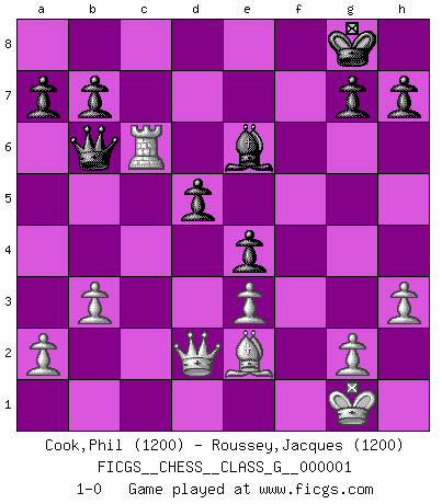 Last move : 1-0 2006 July 2 12:7:13 [Event "FICGS__CHESS__CLASS_G__000001"] [Site "FICGS"] [Date "2006.05.25"] [Round "1"] [White "Cook,Phil"] [Black "Roussey,Jacques"] [Result "1-0"] [WhiteElo "1200"] [BlackElo "1200"] 1.d4 f5 2.h3 Nf6 3.Nc3 d5 4.e3 c6 5.Be2 e6 6.Nf3 Bd6 7.Ne5 Nbd7 8.O-O Nxe5 9.dxe5 Bxe5 10.Bd2 O-O 11.f4 Bc7 12.Be1 e5 13.Bg3 exf4 14.Bxf4 Bxf4 15.Rxf4 Qb6 16.Qd2 Ne4 17.Nxe4 fxe4 18.Rxf8+ Kxf8 19.Rf1+ Kg8 20.c4 Be6 21.cxd5 cxd5 22.b3 Rd8 23.Rd1 Rc8 24.Rc1 Rc6 25.Rxc6 1-0 Dutch, Korchnoi attack Kingside Castling by player White (move 8) Kingside Castling by player Black (move 10) Player White won this chess game. Follow this game move after move (download)Chess problems demand from the composer the same virtues that characterize all worthwhile art: originality, invention, conciseness, harmony, complexity, and splendid insincerity. (Vladimir Nabokov) Unter Putin wird alles Geld aus Russland wie von einem Staubsauger nach Moskau umgeleitet, das ist wie ein schwarzes Loch. (Garry Kasparov) Las Aperturas te enseñan aperturas. ¡Los Finales te enseñan Ajedrez!. (Stephan Gerzadowicz) Ne tendez aucun piège pour le plaisir ! Ne jouez rien dans l'espoir que l'adversaire réagisse de façon stupide ! Prenez toujours pour acquis que l'adversaire va trouver le meilleur coup ! Ne jouez jamais de coup dans l'espoir que l'adversaire ne voie pas la menace ! Chacun de vos coups doit améliorer la position d'une façon ou d'une autre. Somewhere in the world there is an epigram for every dilemma. (Hendrik Willem van Loon)