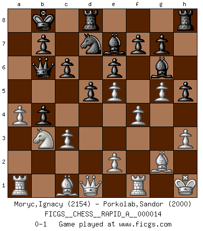 Last move : 0-1 2007 April 11 10:43:10 [Event "FICGS__CHESS__RAPID_A__000014"] [Site "FICGS"] [Date "2007.02.14"] [Round "1"] [White "Moryc,Ignacy"] [Black "Porkolab,Sandor"] [Result "0-1"] [WhiteElo "2154"] [BlackElo "2000"] 1.Nf3 d5 2.g3 c6 3.Bg2 Nf6 4.O-O Bg4 5.d4 Nbd7 6.Nbd2 e6 7.Ne5 Nxe5 8.dxe5 Nd7 9.h3 Bh5 10.g4 Bg6 11.f4 h5 12.g5 Qb6+ 13.Kh1 O-O-O 14.c3 Kb8 15.b4 Be7 16.a4 a5 17.Nb3 axb4 0-1 This chess game has been lost on time (started : 2007.02.14 17:7:33) Reti : King's Indian attack (Barcza system) Kingside Castling by player White (move 4) Queenside Castling by player Black (move 13) Player Black won this chess game. Follow this game move after move (download)Chess is a terrific way for kids to build self image and self esteem. (Saudin Robovic) Du kannst im Schach nur gut werden, wenn du das Spiel liebst. (Robert James Fischer) Fischer era un maestro de claridad y un Rey del posicionamiento astuto. Sus oponentes podían ver hacia donde se dirigía pero eran impotentes para detenerlo. (Bruce Pandolfini) Le plus grand jeu de l'esprit jamais inventé, plus vous l'apprenez, plus vous y prenez du plaisir. (Garry Kasparov) Fame, I have already. Now I need the money. (an elderly Steinitz)