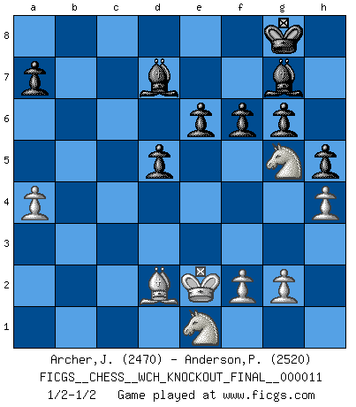 Last move : 1/2-1/2 2014 June 26 2:7:44 [Event "FICGS__CHESS__WCH_KNOCKOUT_FINAL__000011"] [Site "FICGS"] [Date "2014.03.05"] [Round "8"] [White "Archer,J. Robert"] [Black "Anderson,Peter W."] [Result "1/2-1/2"] [WhiteElo "2470"] [BlackElo "2520"] 1.e4 c5 2.Nf3 Nc6 3.Bb5 g6 4.Bxc6 bxc6 5.d4 Ba6 6.dxc5 Qa5+ 7.Nbd2 Nf6 8.c3 Qxc5 9.c4 d5 10.exd5 Bxc4 11.Qc2 cxd5 12.b3 Ng4 13.Nf1 Qb4+ 14.Bd2 Qb6 15.Ne3 Ba6 16.Nxg4 Bg7 17.Rc1 Qe6+ 18.Ne3 Rc8 19.Qb1 O-O 20.Kd1 h5 21.Re1 Qd6 22.Rxc8 Rxc8 23.Bc1 Qf6 24.h4 e6 25.a4 Qc3 26.Bd2 Qc6 27.Ng5 Rb8 28.Nc2 Qxa4 29.bxa4 Rxb1+ 30.Bc1 Bc8 31.Ke2 Bd7 32.Bd2 Rxe1+ 33.Nxe1 f6 1/2-1/2 Comment by player 2 : Peter W. Anderson : Thnaks for the game and the match Robert and well defended in this game. I thought 20.Kd1 was an important and good choice, but perhaps I have something better than 20...h5 Sicilian : Nimzovich-Rossolimo attack (with ...g6, without ...d6) Kingside Castling by player Black (move 19) This chess game ended in a draw. Follow this game move after move (download)Chess is not like life... it has rules ! (Mark Pasternak) Ohne ihre Erfolge schmälern zu wollen würde ich sagen Petrosian, Spassky und Karpov verdanken ihre Siege ihren Trainern - Boleslavsky, Bondarevsky und Furman. (Mikhail Moiseyevich Botvinik) Desconfianza es la característica mas necesaria de un jugador de Ajedrez. (Siegbert Tarrasch) Des idées, des idées, j'en ai cent, j'en ai mille. Des bonnes, des mauvaises, applicables, irréalisables... Il suffit de faire le tri ! (Roos) The right perception of any matter and a misunderstanding of the same matter do not wholly exclude each other. (Kafka's the trial)