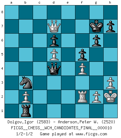 Last move : 1/2-1/2 2014 May 30 11:49:4 [Event "FICGS__CHESS__WCH_CANDIDATES_FINAL__000010"] [Site "FICGS"] [Date "2014.03.05"] [Round "7"] [White "Dolgov,Igor"] [Black "Anderson,Peter W."] [Result "1/2-1/2"] [WhiteElo "2583"] [BlackElo "2520"] 1.e4 c5 2.Nf3 Nc6 3.Nc3 e5 4.Bc4 Be7 5.d3 d6 6.O-O Nf6 7.h3 O-O 8.a3 a6 9.Bd2 b5 10.Ba2 Be6 11.Nd5 Bxd5 12.exd5 Nd4 13.Nxd4 cxd4 14.c3 dxc3 15.Bxc3 Nd7 16.Rc1 a5 17.Bb1 Bg5 18.Bd2 Bxd2 19.Qxd2 g6 20.d4 exd4 21.Qxd4 Nc5 22.Rce1 b4 23.axb4 axb4 24.f4 f5 25.Qxb4 Qf6 26.Qd2 Rfb8 27.Rf2 Rb3 28.Re3 Ra1 29.Rxb3 Rxb1+ 30.Kh2 Nxb3 31.Qc2 Qd4 32.Qc8+ Kg7 33.Qd7+ 1/2-1/2 Sicilian defense Kingside Castling by player White (move 6) Kingside Castling by player Black (move 7) This chess game ended in a draw. Follow this game move after move (download)When you absolutely don't know what to do anymore, it is time to panic. (John van der Wiel) Es gibt zwei Arten von Opfern: Korrekte und meine. (Mikhail Nekhemyevich Tal) Los Peones son el alma de una partida de Ajedrez. (Francois Andre Danican Philidor) Il n'y a plus de joueurs du niveau de Jacob Murray dont la seule quête est le beau jeu, le plaisir de voir les pièces construire quelque chose. Sur 10 idées à la minute, 9 seront sans intérêt, la dernière s'avèrera géniale. (Christian Bauer) The ego is not master in its own house. (Sigmund Freud)