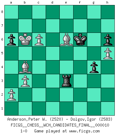 Last move : 1-0 2014 September 14 7:54:26 [Event "FICGS__CHESS__WCH_CANDIDATES_FINAL__000010"] [Site "FICGS"] [Date "2014.03.05"] [Round "8"] [White "Anderson,Peter W."] [Black "Dolgov,Igor"] [Result "1-0"] [WhiteElo "2520"] [BlackElo "2583"] 1.e4 c5 2.Nf3 Nc6 3.Nc3 Nf6 4.Bb5 Qc7 5.O-O Nd4 6.Re1 a6 7.Bf1 Ng4 8.e5 Nxf3+ 9.Qxf3 Nxe5 10.Qh5 d6 11.f4 Nc6 12.Nd5 Qd8 13.b3 Nd4 14.Bd3 e5 15.fxe5 Be6 16.c3 dxe5 17.Qxe5 Nc6 18.Qe4 Bd6 19.Bc2 Be5 20.Nf4 g6 21.Nxe6 fxe6 22.g3 O-O 23.Qe3 Rc8 24.Be4 Bf6 25.Rf1 Rf7 26.Bg2 R8c7 27.Ba3 Nb4 28.Rxf6 Nc2 29.Qe4 Nxa1 30.Rxe6 Qxd2 31.Re8+ Kg7 32.Qe5+ Kh6 33.h4 Nc2 34.Bxc5 Qe1+ 35.Qxe1 Nxe1 36.Be3+ Kh5 37.Re5+ Rf5 38.Re4 Nf3+ 39.Kh1 R5f7 40.Bh3 g5 41.Bg4+ Kg6 42.h5+ Kg7 43.c4 Rc6 44.Bc1 Rd6 45.Kg2 Rd3 46.Bb2+ Kf8 47.Ba3+ Kg7 48.Bb4 h6 49.Be6 Rf6 50.Bd5 Nd4 51.Re7+ Kh8 52.Re8+ Kg7 53.Rg8+ Kh7 54.Rd8 Re3 55.Bxb7 Nc6 56.Rd6 Re2+ 57.Kg1 Rxd6 58.Bxd6 Nd8 59.Bd5 Kg7 60.Bc7 Ne6 61.Kf1 Nd4 62.Ba5 Rc2 63.Be4 Rc1+ 64.Kf2 Kf7 65.Ke3 Ne6 66.Bg6+ Ke7 67.Bb4+ Kf6 68.Ke4 Nd8 69.Kd5 Ne6 70.Be4 g4 71.Kd6 Ng5 72.Bd5 Rd1 73.Kc6 Nf3 74.Kb6 Rd3 75.Bb7 Nd4 76.c5 Rxg3 77.c6 Ne6 78.Bc8 Re3 79.Bxe6 1-0 This chess game has been lost on time (started : 2014.03.05 20:1:52) Sicilian defense Kingside Castling by player White (move 5) Kingside Castling by player Black (move 22) Player White won this chess game. Follow this game move after move (download)Chess is so inspiring that I do not believe a good player is capable of having an evil thought during the game. (Wilhelm Steinitz) Kombinieren und Schwarzhandel gehören verboten. (Savielly Grigorievitsch Tartakower) El tablero es el mundo, las piezas es el fenomeno del universo, las reglas del juego son lo que llamamos leyes de la naturaleza y el jugador del lado opuesto, se encuentra oculto a nuestra vista. (Thomas Huxley) Si rien de grave n'est détecté lors de l'analyse d'une position, on joue alors le coup. Seconde règle de Blumenfeld. Go and wake up your luck. (Persian saying)