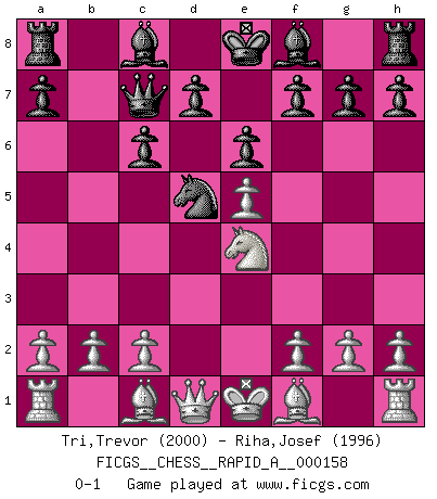 Last move : 0-1 2014 April 24 8:19:56 [Event "FICGS__CHESS__RAPID_A__000158"] [Site "FICGS"] [Date "2014.03.08"] [Round "1"] [White "Tri,Trevor"] [Black "Riha,Josef"] [Result "0-1"] [WhiteElo "2000"] [BlackElo "1996"] 1.e4 c5 2.Nf3 Nc6 3.d4 cxd4 4.Nxd4 e6 5.Nc3 Nf6 6.Nxc6 bxc6 7.e5 Nd5 8.Ne4 Qc7 0-1 This chess game has been lost on time (started : 2014.03.08 0:38:46) Sicilian defense Player Black won this chess game. Follow this game move after move (download)We must make sure that Chess will not be like a dead language, very interesting, but for a very small group. (Sytze Faber) Früher wurde jeder komplizierte Zug, jedes interessante Opfer mit großem Beifall und Enthusiasmus aufgenommen. Heute schaltet man einfach seinen Fritz an, und man kann sehen, was los ist, ob der Zug geht oder nicht. (Vladimir Kramnik) Después de una mala apertura, hay una esperanza en el juego medio. Pero una vez que estas en finales, el momento de la verdad ha llegado. (Edmar Mednis) Mais n'est-ce pas déjà le limiter injurieusement que d'appeler les échecs un jeu? N'est-ce pas aussi une science, un art, ou quelque chose qui, comme le cercueil de Mahomet entre ciel et terre, est suspendu entre l'un et l'autre, et qui réunit un nombre incroyable de contraires ? (Stefan Zweig) Computers have lots of memory but no imagination. (Anonymous)