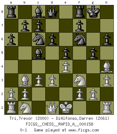 Last move : 0-1 2014 April 26 8:20:21 [Event "FICGS__CHESS__RAPID_A__000158"] [Site "FICGS"] [Date "2014.03.08"] [Round "1"] [White "Tri,Trevor"] [Black "DiAlfonso,Darren"] [Result "0-1"] [WhiteElo "2000"] [BlackElo "2061"] 1.e4 e5 2.Nf3 Nc6 3.Bc4 Bc5 4.c3 Nf6 5.d3 a6 6.h3 O-O 7.Bb3 d6 8.Bg5 h6 9.Bh4 g5 0-1 This chess game has been lost on time (started : 2014.03.08 0:38:46) Giuoco Piano Kingside Castling by player Black (move 6) Player Black won this chess game. Follow this game move after move (download)The stomach is an essential part of the Chess master. (Bent Larsen) Eine Person mit durchschnittlichem IQ kann etwa eine ELO von 2000 erreichen. (Jonathan Levitt) No volvere nunca a jugar contigo. Has insultado a mi amigo. - cuando un oponente se maldijo por una mala jugada (Miguel Najdorf) Les écrivains ont utilisé les échecs pour analyser les côtés extrêmes de la nature humaine. Dans ce cadre, les échecs offrent un champ d'expérimentation idéal. Mais on pourrait faire la même chose avec la peinture. Et là, en vous référant à Van Gogh, vous ne tirerez pas de conclusion définitive sur les peintres. (Gary Kasparov) Life is verb, not a noun. (Charlotte Perkins Gilman)