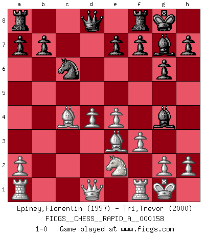 Last move : 1-0 2014 April 26 20:21:43 [Event "FICGS__CHESS__RAPID_A__000158"] [Site "FICGS"] [Date "2014.03.08"] [Round "1"] [White "Epiney,Florentin"] [Black "Tri,Trevor"] [Result "1-0"] [WhiteElo "1997"] [BlackElo "2000"] 1.d4 Nf6 2.c4 g6 3.Nc3 d5 4.cxd5 Nxd5 5.e4 Nxc3 6.bxc3 Bg7 7.Bc4 c5 8.Ne2 Nc6 9.Be3 O-O 10.O-O cxd4 11.cxd4 Bg4 12.f3 1-0 This chess game has been lost on time (started : 2014.03.08 0:38:46) King's Indian defense, 3.Nc3 Kingside Castling by player Black (move 9) Kingside Castling by player White (move 10) Player White won this chess game. Follow this game move after move (download)The Pin is mightier than the sword. (Fred Reinfeld) Auf Remis zu spielen ist gewissermaßen ein Verbrechen gegen das Schachspiel. (Mikhail Nekhemyevich Tal) Tu puedes aprender mucho mas de una partida que pierdas que de una partida ganada. Tendras que perder cientos de partidas antes de llegar a ser un buen jugador. (Jose Raul Capablanca) La vie et les Echecs sont tous les deux une lutte constante. (Lasker) In my experience, there's no such thing as luck. (Obi-Wan Kenobi in Star Wars ep.4)