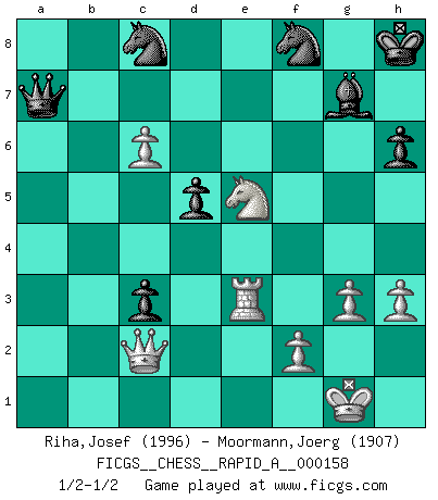 Last move : 1/2-1/2 2014 May 14 0:53:25 [Event "FICGS__CHESS__RAPID_A__000158"] [Site "FICGS"] [Date "2014.03.08"] [Round "1"] [White "Riha,Josef"] [Black "Moormann,Joerg"] [Result "1/2-1/2"] [WhiteElo "1996"] [BlackElo "1907"] 1.Nf3 d5 2.d4 c6 3.c4 e6 4.Qc2 Nf6 5.Bg5 h6 6.Bh4 dxc4 7.Qxc4 b5 8.Qc2 Bb7 9.e3 Nbd7 10.Nbd2 Rc8 11.Be2 a6 12.a4 c5 13.d5 exd5 14.axb5 axb5 15.Bxb5 g5 16.Bg3 Bg7 17.O-O O-O 18.Qf5 Bc6 19.Bxc6 Rxc6 20.Ra7 Qc8 21.Rfa1 Nb8 22.Qc2 Qe6 23.h3 Nbd7 24.R1a2 Nh5 25.Bh2 f5 26.Qd1 Nhf6 27.b4 g4 28.b5 Rb6 29.Bc7 gxf3 30.Bxb6 Nxb6 31.Nxf3 Nfd7 32.R2a6 Qe4 33.Rb7 Rf6 34.R6a7 Rd6 35.Rc7 c4 36.Rc6 Rf6 37.Ra3 f4 38.exf4 Qxf4 39.Re3 Nf8 40.Qb1 Kh8 41.g3 Qb8 42.Qd1 Qa7 43.Ne5 Rxc6 44.bxc6 c3 45.Qc2 Nc8 1/2-1/2 Reti Opening Kingside Castling by player White (move 17) Kingside Castling by player Black (move 17) This chess game ended in a draw. Follow this game move after move (download)Human affairs are like a Chess game: only those who do not take it seriously can be called good players. (Hung Tzu Ch'eng) Ein Teil des Fehlers ist immer korrekt. (Savielly Grigorievitsch Tartakower) El Ajedrez moderno está demasiado preocupado con cosas como la estructura de Peones. Olvidenlo, el Jaque Mate termina la partida. (Nigel Short) Seul un grand joueur sait à quel point il joue faiblement. (Xavier Tartacover) Never risk one's whole fortune unless supported by one's entire army. (Niccolo Machiavelli)