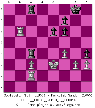 Last move : 0-1 2007 June 23 2:27:10 [Event "FICGS__CHESS__RAPID_A__000014"] [Site "FICGS"] [Date "2007.02.14"] [Round "1"] [White "Sobietski,Piotr"] [Black "Porkolab,Sandor"] [Result "0-1"] [WhiteElo "1800"] [BlackElo "2000"] 1.e4 c5 2.c3 d5 3.exd5 Qxd5 4.d4 Nf6 5.Nf3 Bg4 6.Be2 e6 7.h3 Bh5 8.Be3 Nc6 9.O-O cxd4 10.Nxd4 Nxd4 11.Bxd4 Bxe2 12.Qxe2 Be7 13.Rd1 Qh5 14.Qxh5 Nxh5 15.Nd2 O-O 16.g3 Rfd8 17.Nb3 b6 18.Kg2 Rac8 19.a4 Nf6 20.a5 Nd5 21.axb6 axb6 22.Ra7 b5 23.Rc1 Bg5 24.f4 Bf6 25.Bxf6 gxf6 26.Kf2 Nb6 27.Ke2 Nc4 28.Rc2 h5 29.Nd4 b4 30.Ra4 bxc3 31.bxc3 Nb6 32.Ra6 Rxd4 33.Rxb6 h4 34.Ke3 Rdc4 0-1 This chess game has been lost on time (started : 2007.02.14 17:7:33) Sicilian : Alapin's variation (2.c3) Kingside Castling by player White (move 9) Kingside Castling by player Black (move 15) Player Black won this chess game. Follow this game move after move (download)Weak points or holes in the opponent's position must be occupied by pieces not Pawns. (Siegbert Tarrasch) Zu meiner Zeit war ein 20 jähriger ein junger Spieler, heute ist er ein Veteran. (Garry Kasparov) En partidas rápidas, el Caballo es mas poderoso que el Alfil. (Vlastimil Hort) Le thème de l'attaque double intervient d'une manière ou d'une autre dans l'immense majorité des combinaisons. (Youri Averbakh) When it is a question of money, everybody is of the same religion. (Voltaire)
