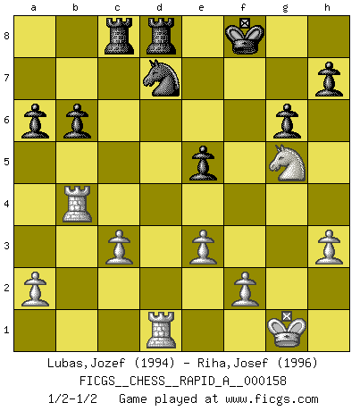 Last move : 1/2-1/2 2014 March 16 18:25:55 [Event "FICGS__CHESS__RAPID_A__000158"] [Site "FICGS"] [Date "2014.03.08"] [Round "1"] [White "Lubas,Jozef"] [Black "Riha,Josef"] [Result "1/2-1/2"] [WhiteElo "1994"] [BlackElo "1996"] 1.d4 Nf6 2.c4 g6 3.Nc3 d5 4.Nf3 Bg7 5.Bf4 O-O 6.e3 c5 7.dxc5 Qa5 8.Qa4 Qxc5 9.Rd1 Bd7 10.Qb3 dxc4 11.Bxc4 Nc6 12.Qb5 Qxb5 13.Bxb5 Rac8 14.O-O Rfd8 15.h3 Nh5 16.Bg5 Bxc3 17.bxc3 f6 18.Bh6 Ne5 19.Bxd7 Nxd7 20.Rd4 e5 21.Ra4 a6 22.Rb4 b6 23.Rd1 Ng7 24.Bxg7 Kxg7 25.g4 Kf8 26.g5 fxg5 27.Nxg5 1/2-1/2 King's Indian defense, 3.Nc3 Kingside Castling by player Black (move 5) Kingside Castling by player White (move 14) This chess game ended in a draw. Follow this game move after move (download)I play correspondence chess because it is both art and science while chess is art only. (A player at FICGS) Die Jungen erwarten, dass Opa einfach umfällt. Dann aber kann Opa fünf Stunden lang Schach spielen und die jungen Gegner an die Wand drücken. (Viktor Kortschnoi) Existen dos clases de sacrificios: los correctos y los míos. (Mikhail Tal) Dans le domaine de la peinture, de la gravure et de la sculpture, dès la première décennie de notre siècle, les artistes abandonnent la représentation de la partie d'échecs pour se concentrer sur les pièces, sur les échiquiers et sur toutes les variations auxquelles les unes et les autres peuvent donner lieu. On passe en quelque sorte d'un thème social à un thème musical (au sens de la musica médiévale, c'est-à-dire d'une notion qui inclue le rythme, l'harmonie, la construction et la déconstruction, etc.). Graphiquement et picturalement, l'échiquier apparaît comme une structure ouverte, dynamique, d'une richesse infinie, autorisant toutes les combinatoires et débouchant sur des mouvements et des rythmes de nature exponentielle. (Michel Pastoureau) Creativity is inventing, experimenting, growing, taking risks, breaking rules, making mistakes, and having fun. (Mary Lou Cook)