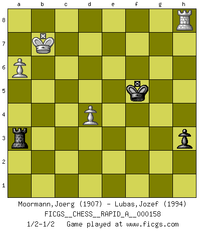 Last move : 1/2-1/2 2014 June 18 21:27:42 [Event "FICGS__CHESS__RAPID_A__000158"] [Site "FICGS"] [Date "2014.03.08"] [Round "1"] [White "Moormann,Joerg"] [Black "Lubas,Jozef"] [Result "1/2-1/2"] [WhiteElo "1907"] [BlackElo "1994"] 1.e4 e5 2.Nf3 Nc6 3.Bb5 a6 4.Ba4 Nf6 5.O-O Be7 6.Re1 b5 7.Bb3 O-O 8.c3 d6 9.h3 Na5 10.Bc2 c5 11.d4 cxd4 12.cxd4 Qc7 13.Nbd2 Bb7 14.d5 Rfc8 15.Bd3 Nc4 16.Nxc4 bxc4 17.Bf1 a5 18.Re3 Ba6 19.Qc2 Rab8 20.Rc3 Nd7 21.Be3 Qb7 22.Rb1 f5 23.exf5 Qxd5 24.Rc1 e4 25.Nd2 Ne5 26.Nxc4 Nxc4 27.Rxc4 Bxc4 28.Bxc4 Rxc4 29.Qxc4 Qxc4 30.Rxc4 d5 31.Ra4 Rb5 32.g4 Bc5 33.b3 Bxe3 34.fxe3 Kf7 35.Kf2 g6 36.Kg3 Kf6 37.b4 axb4 38.Ra6+ Kf7 39.Kf4 gxf5 40.gxf5 d4 41.exd4 e3 42.Re6 Rd5 43.Kxe3 Rxf5 44.Re5 Rf6 45.Kd3 Rc6 46.Rf5+ Ke7 47.h4 Rc3+ 48.Ke4 Rc2 49.Rb5 Rh2 50.Rxb4 Rxh4+ 51.Kd5 Rh2 52.a4 h5 53.a5 Ra2 54.Rb7+ Kf6 55.Rb5 h4 56.Kc6 Rc2+ 57.Kd7 h3 58.Rh5 Rc3 59.a6 Ra3 60.Kc7 Kg6 61.Rh8 Kf5 62.Kb7 Rb3+ 63.Kc6 Ra3 64.Kb7 Rb3+ 65.Kc6 Ra3 66.Kb7 1/2-1/2 Ruy Lopez : Closed, 7...O-O Kingside Castling by player White (move 5) Kingside Castling by player Black (move 7) 10 pieces endgame at move 43 : White KRPPPP , Black KRPP WHITE : King + 1 Rook 4 Pawns BLACK : King + 1 Rook 2 Pawns 9 pieces endgame at move 43 : White KRPPP , Black KRPP WHITE : King + 1 Rook 3 Pawns BLACK : King + 1 Rook 2 Pawns 8 pieces endgame at move 50 : White KRPPP , Black KRP WHITE : King + 1 Rook 3 Pawns BLACK : King + 1 Rook 1 Pawn 7 pieces endgame at move 50 : White KRPP , Black KRP WHITE : King + 1 Rook 2 Pawns BLACK : King + 1 Rook 1 Pawn This chess game ended in a draw. Follow this game move after move (download)Daring ideas are like Chess men moved forward. They may be beaten, but they may start a winning game. (Johann Wolfgang von Goethe) Schach ist ein schwarz-weisser Dschungel. (Garry Kasparov) Tu cuerpo tiene que estar en óptima condición. Tu Ajedrez se deteriora como lo hace tu cuerpo. No puedes separar la mente y el cuerpo. (Bobby Fischer) Les sacrifices démontrent seulement que quelqu'un a gaffé. (Savielly Tartacover) The greatest con, that he ever pulled... was making you believe... that he is you. (Revolver, movie)