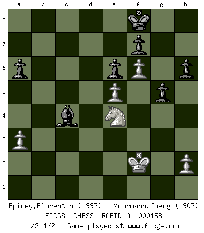 Last move : 1/2-1/2 2014 April 22 15:21:43 [Event "FICGS__CHESS__RAPID_A__000158"] [Site "FICGS"] [Date "2014.03.08"] [Round "1"] [White "Epiney,Florentin"] [Black "Moormann,Joerg"] [Result "1/2-1/2"] [WhiteElo "1997"] [BlackElo "1907"] 1.d4 d5 2.c4 e6 3.Nc3 c6 4.e3 Nf6 5.Nf3 Nbd7 6.Bd3 dxc4 7.Bxc4 b5 8.Bd3 Bb7 9.e4 b4 10.Na4 c5 11.e5 Nd5 12.O-O cxd4 13.Re1 g6 14.Bg5 Qa5 15.Nxd4 a6 16.a3 bxa3 17.bxa3 Bg7 18.Bd2 Qd8 19.Rb1 Rb8 20.f4 O-O 21.Be4 Ba8 22.Rc1 Rc8 23.Nf3 Rxc1 24.Qxc1 Qb8 25.Qc4 Qa7+ 26.Qd4 Qxd4+ 27.Nxd4 Rb8 28.Nc3 N7b6 29.Bxd5 Nxd5 30.Nxd5 Bxd5 31.Bb4 Rc8 32.Re3 Bh6 33.Ne2 Rc2 34.g4 g5 35.f5 Bf8 36.Bxf8 Kxf8 37.f6 Rc4 38.Rc3 Rxg4+ 39.Ng3 Rc4 40.Rxc4 Bxc4 41.Ne4 h6 42.Kf2 1/2-1/2 QGD : Semi-Slav Kingside Castling by player White (move 12) Kingside Castling by player Black (move 20) This chess game ended in a draw. Follow this game move after move (download)It is always better to sacrifice your opponent's men. (Savielly Tartakower) Ich bin der einzige Schachspieler, der sich während der Vorbereitungen zum Turnier verletzt hat. (Woody Allen) No hay un Gran Maestro de Ajedrez que sea normal; solo se diferencían ellos por la magnitud de su locura. (Viktor Korchnoi) Votre prénom est 'Tactique', votre deuxième prénom est 'Tactique' et votre nom est 'Tactique'. (Ken Smith) To send light into the darkness of men's hearts - such is the duty of the artist. (Schumann)