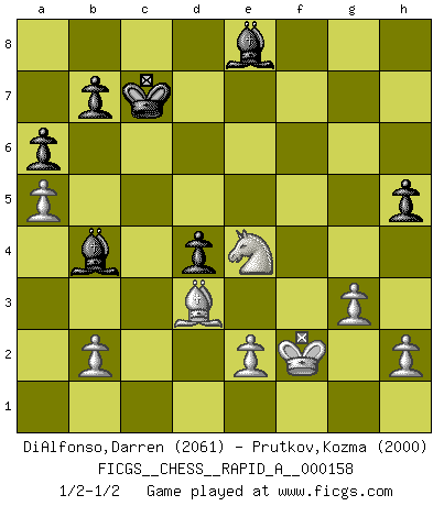 Last move : 1/2-1/2 2014 April 10 20:59:39 [Event "FICGS__CHESS__RAPID_A__000158"] [Site "FICGS"] [Date "2014.03.08"] [Round "1"] [White "DiAlfonso,Darren"] [Black "Prutkov,Kozma"] [Result "1/2-1/2"] [WhiteElo "2061"] [BlackElo "2000"] 1.d4 d5 2.c4 c6 3.Nf3 Nf6 4.Nc3 dxc4 5.a4 Bf5 6.Ne5 Nbd7 7.Nxc4 Qc7 8.g3 e5 9.dxe5 Nxe5 10.Bf4 Nfd7 11.Bg2 f6 12.O-O g5 13.Nxe5 gxf4 14.Nxd7 Qxd7 15.a5 fxg3 16.fxg3 a6 17.Be4 Bh3 18.Qxd7+ Bxd7 19.Rxf6 O-O-O 20.Kg2 h5 21.Ra4 Kb8 22.Bf5 Be8 23.Bd3 Bd6 24.Ne4 c5 25.Rc4 Bc6 26.Kf1 Be7 27.Re6 Bf8 28.Nc3 Rd4 29.Rxd4 cxd4 30.Ne4 Bb4 31.Re5 Re8 32.Rxe8+ Bxe8 33.Kf2 Kc7 1/2-1/2 QGD Slav : Krause attack Kingside Castling by player White (move 12) Queenside Castling by player Black (move 19) This chess game ended in a draw. Follow this game move after move (download)Pawn endings are to Chess what putting is to golf. (Cecil Purdy) Fischer: 'Remis!?' Uhlmann: 'Aber es muss doch dreimal Zugwiederholung sein!' Fischer: 'Sie nehmen das Remis an, wie ich es sage, sonst spiele ich weiter und werde Sie dann schlagen!' (Robert James Fischer) Aunque la mayoría de la gente disfruta observar las partidas de los grandes Maestros de ataque, algunos de los jugadores mas notables en la historia han sido los jugadores silenciosos posicionales. Lentamente ellos te aplastan despojandote de tu espacio, congestionando tus piezas y dejandote virtualmente sin nada que hacer. (Yasser Seirawan) Des combinaisons [dans le jeu d'échecs] pareilles à des mélodies. Je crois entendre pour ainsi dire la musique des coups... (Vladimir Nabokov) The faster the computer, the slower the brain. (Thibault de Vassal)