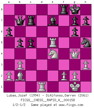Last move : 1/2-1/2 2014 March 16 22:6:12 [Event "FICGS__CHESS__RAPID_A__000158"] [Site "FICGS"] [Date "2014.03.08"] [Round "1"] [White "Lubas,Jozef"] [Black "DiAlfonso,Darren"] [Result "1/2-1/2"] [WhiteElo "1994"] [BlackElo "2061"] 1.e4 e5 2.Nf3 Nc6 3.Bb5 a6 4.Ba4 Nf6 5.O-O Be7 6.Re1 b5 7.Bb3 d6 8.c3 O-O 9.d4 Bg4 10.Be3 exd4 11.cxd4 Na5 12.Bc2 Nc4 13.Bc1 c5 14.b3 Na5 15.Nbd2 Nc6 16.d5 Nd4 17.h3 Bh5 18.Bb2 Nxc2 19.Qxc2 Bg6 20.Nh4 Nh5 21.Nxg6 fxg6 22.e5 dxe5 23.Rad1 Qxd5 24.Rxe5 Qb7 25.Ne4 Rac8 26.Qe2 Rc7 27.Qg4 1/2-1/2 Ruy Lopez : Closed Kingside Castling by player White (move 5) Kingside Castling by player Black (move 8) This chess game ended in a draw. Follow this game move after move (download)The battle for the ultimate truth will never be won. And that's why Chess is so fascinating. (Hans Kmoch) Um dein Spiel zu verbessern musst du zuallererst das Endspiel studieren, denn diese kann unabhängig studiert werden. Die Eröffnung und das Mittelspiel müssen immer in Bezug gesetzt werden zum Endspiel. (José Raúl Capablanca) Si no le temes a Spassky, entonces elimino el elemento del dinero. (Jim Slater) La victoire dans une partie d'Echecs appartient la plupart du temps à celui qui voit un peu plus loin que l'adversaire. (Lasker) Crush them ! Make them suffer ! (General Grievous in Star Wars ep.3)