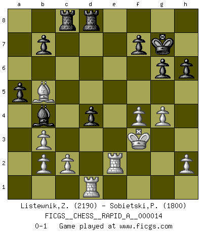 Last move : 0-1 2007 May 25 5:3:9 [Event "FICGS__CHESS__RAPID_A__000014"] [Site "FICGS"] [Date "2007.02.14"] [Round "1"] [White "Listewnik,Zbigniew"] [Black "Sobietski,Piotr"] [Result "0-1"] [WhiteElo "2190"] [BlackElo "1800"] 1.e4 c5 2.Nf3 d6 3.d4 cxd4 4.Nxd4 Nf6 5.Nc3 Nc6 6.f3 e5 7.Nb3 Be7 8.Be3 O-O 9.Qd2 a5 10.Bb5 Na7 11.Bd3 Be6 12.O-O Nc6 13.Bb5 d5 14.exd5 Nxd5 15.Nxd5 Qxd5 16.Qxd5 Bxd5 17.Rad1 Bxb3 18.axb3 Nd4 19.Bxd4 exd4 20.Rfe1 Bb4 21.Re2 Rac8 22.g4 Rfd8 23.Kg2 g6 24.f4 Kg7 25.Kf3 h6 0-1 This chess game has been lost on time (started : 2007.02.14 17:7:33) Sicilian Kingside Castling by player Black (move 8) Kingside Castling by player White (move 12) Player Black won this chess game. Follow this game move after move (download)Checkers is for tramps. (Paul Morphy) Ich habe die Schachforschung dermaßen betrieben, dass sie auf eine wissenschaftliche Basis gestellt wurde. (Mikhail Moiseyevich Botvinik) El Ajedrez no es una pizca de inferior al violín, y tenemos un gran número de violinistas profesionales. (Mikhail Botvinnik) Des idées, des idées, j'en ai cent, j'en ai mille. Des bonnes, des mauvaises, applicables, irréalisables... Il suffit de faire le tri ! (Roos) Happy endings are just stories that haven't finished yet. (Jane Smith in Mr & Mrs Smith)