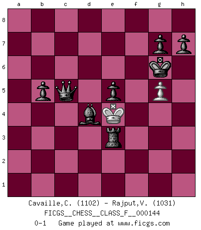 Last move : 0-1 2014 March 22 16:19:28 [Event "FICGS__CHESS__CLASS_F__000144"] [Site "FICGS"] [Date "2014.03.08"] [Round "1"] [White "Cavaille,Cedric"] [Black "Rajput,Vishalsingh"] [Result "0-1"] [WhiteElo "1102"] [BlackElo "1031"] 1.e4 e5 2.Nf3 Nc6 3.d4 exd4 4.Nxd4 Nxd4 5.Qxd4 Qf6 6.Qxf6 Nxf6 7.f3 Bc5 8.Bg5 Ng8 9.Nc3 Ne7 10.Bxe7 Bxe7 11.Nd5 Bd6 12.f4 c6 13.e5 Bb8 14.Ne3 O-O 15.Bd3 b5 16.O-O Re8 17.b4 f6 18.Ng4 fxe5 19.fxe5 d6 20.Rf4 dxe5 21.Re4 Bf5 22.Re3 Bxg4 23.Be4 Bd7 24.Rd1 Bg4 25.Rd2 Bc7 26.Bxc6 Bb6 27.Bxa8 Bxe3+ 28.Kf1 Bxd2 29.Bc6 Rb8 30.h3 Be6 31.a3 Bc1 32.c3 Bxa3 33.Ke2 Bc4+ 34.Ke3 Bb2 35.Ke4 Bxc3 36.Kf5 Rf8+ 37.Ke4 Rf4+ 38.Ke3 Bd4+ 39.Kd2 Rf2+ 40.Ke1 Re2+ 41.Kd1 Kf7 42.Bf3 Rb2 43.g4 Rh2 44.g5 Rxh3 45.Be2 Bxe2+ 46.Kxe2 Rb3 47.Kd2 Rxb4 48.Kd3 Rb3+ 49.Ke4 Kg6 50.Kd5 a5 51.Kc6 a4 52.Kd5 a3 53.Kc6 a2 54.Kb7 a1Q 55.Kc6 Qc3+ 56.Kd5 Qc5+ 57.Ke4 Re3+ 0-1 Scotch game Kingside Castling by player Black (move 14) Kingside Castling by player White (move 16) 10 pieces endgame at move 47 : White KP , Black KRBPPPPP WHITE : King + 1 Pawn BLACK : King + 1 Rook 1 Bishop 5 Pawns Promotion Queen by player Black (move 54) Player Black won this chess game. Follow this game move after move (download)He who fears an isolated Queen's Pawn should give up Chess. (Siegbert Tarrasch) Wie, soll nun auch die Opposition abgeschafft werden? Ja, es tut mir leid, Ihnen diesen Schmerz nicht ersparen zu können. (Aaron Nimzowitsch) Si el Ajedrez es una ciencia, es la mas inexacta. Si el Ajedrez es un arte, es demasiado inexacto para ser visto como tal. Si el Ajedrez es un deporte, es demasiado esotérico. Si el Ajedrez es un juego, es demasiado exigente para ser solo un juego. Si el Ajedrez es una aventura, es una muy demandante. Si el Ajedrez es una pasión, es una muy gratificante. Si el Ajedrez es la vida, es una muy triste. (Anónimo) Vous m'avez demandé de vous exposer quel est le fondement de la prière. Je ne fais que préparer les pièces du jeu sur la table... Nous sera-t-il permis d'en adopter les règles et si nous les appliquons scrupuleusement nous ne tarderons pas à faire mat le Roi divin ! Il ne pourra échapper à nos mains. (Sainte Thérèse d'Avila, Chemin de perfection) Children in the dark cause accidents, accidents in the dark cause children. (Unknown)