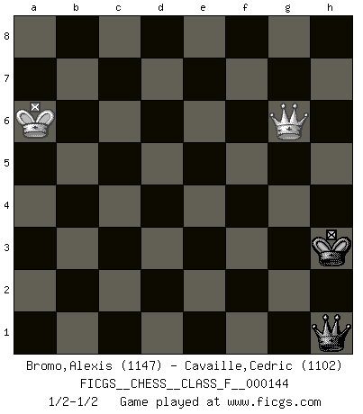 Last move : 1/2-1/2 2014 March 12 19:51:11 [Event "FICGS__CHESS__CLASS_F__000144"] [Site "FICGS"] [Date "2014.03.08"] [Round "1"] [White "Bromo,Alexis"] [Black "Cavaille,Cedric"] [Result "1/2-1/2"] [WhiteElo "1147"] [BlackElo "1102"] 1.d4 d5 2.c4 dxc4 3.Nc3 e6 4.a3 Nf6 5.e3 a6 6.Bxc4 b5 7.Ba2 Bb7 8.Nf3 Be7 9.h3 c5 10.dxc5 Qxd1+ 11.Nxd1 Bxc5 12.Bd2 Bxf3 13.gxf3 O-O 14.Nc3 Nc6 15.O-O-O Rfd8 16.f4 b4 17.axb4 Nxb4 18.Kb1 Nxa2 19.Kxa2 Bb4 20.f3 Bxc3 21.Bxc3 Rxd1 22.Rxd1 Nd5 23.Rd3 h6 24.Ka3 Kh7 25.b4 Nxc3 26.Rxc3 Kg6 27.e4 Kh5 28.Ka4 Kh4 29.f5 exf5 30.exf5 Kxh3 31.Ka5 Kg3 32.Rc6 h5 33.Rxa6 Rxa6+ 34.Kxa6 h4 35.b5 h3 36.b6 h2 37.b7 h1Q 38.b8Q+ Kh3 39.Qh8+ Kg2 40.Qxg7+ Kxf3 41.Qc3+ Kf4 42.Qc7+ Kxf5 43.Qxf7+ Kg4 44.Qg6+ Kh3 1/2-1/2 Queen's gambit accepted Kingside Castling by player Black (move 13) Queenside Castling by player White (move 15) 10 pieces endgame at move 33 : White KRPPP , Black KRPPP WHITE : King + 1 Rook 3 Pawns BLACK : King + 1 Rook 3 Pawns 9 pieces endgame at move 33 : White KPPP , Black KRPPP WHITE : King + 3 Pawns BLACK : King + 1 Rook 3 Pawns 8 pieces endgame at move 34 : White KPPP , Black KPPP WHITE : King + 3 Pawns BLACK : King + 3 Pawns Promotion Queen by player Black (move 37) Promotion Queen by player White (move 38) 7 pieces endgame at move 40 : White KQPP , Black KQP WHITE : King + 1 Queen 2 Pawns BLACK : King + 1 Queen 1 Pawn 6 pieces endgame at move 40 : White KQP , Black KQP WHITE : King + 1 Queen 1 Pawn BLACK : King + 1 Queen 1 Pawn 5 pieces endgame at move 42 : White KQ , Black KQP WHITE : King + 1 Queen BLACK : King + 1 Queen 1 Pawn 4 pieces endgame at move 43 : White KQ , Black KQ WHITE : King + 1 Queen BLACK : King + 1 Queen This chess game ended in a draw. Follow this game move after move (download)Chess is mental torture. (Garry Kasparov) Wer mein Gambit spielt, muß bereit sein, alle Brücken hinter sich abzubrechen. Es verändert den ganzen Menschen. Es wirkt wie ein Zauberstab und fördert verkümmerte, gute Charakter- eigenschaften wieder zu Tage. (Emil Joseph Diemer) Realmente no sabemos como el juego fue inventado, aunque hay sospechas. Tan pronto como descubramos a los culpables, se los haremos saber. (Bruce Pandolfini) Les écrivains ont utilisé les échecs pour analyser les côtés extrêmes de la nature humaine. Dans ce cadre, les échecs offrent un champ d'expérimentation idéal. Mais on pourrait faire la même chose avec la peinture. Et là, en vous référant à Van Gogh, vous ne tirerez pas de conclusion définitive sur les peintres. (Gary Kasparov) Chess is everything: art, science and sport. (Anatoly Karpov)