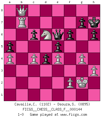 Last move : 1-0 2014 April 30 13:24:54 [Event "FICGS__CHESS__CLASS_F__000144"] [Site "FICGS"] [Date "2014.03.08"] [Round "1"] [White "Cavaille,Cedric"] [Black "Dsouza,Stanislaus"] [Result "1-0"] [WhiteElo "1102"] [BlackElo "0895"] 1.e4 c5 2.Nf3 Nc6 3.Bb5 a6 4.Bxc6 dxc6 5.c4 Bg4 6.h3 Bh5 7.O-O Nf6 8.d3 e6 9.Bg5 Be7 10.Nbd2 Rf8 11.Qe1 h6 12.Bxf6 Bxf6 13.g4 Bg6 14.Qe3 Bxb2 15.Rab1 Bd4 16.Qe2 f6 17.Rxb7 Qc8 18.R7b1 Rb8 19.Rxb8 Qxb8 20.Nb3 e5 21.Nfxd4 cxd4 22.Rb1 Qc7 23.a4 Kf7 24.Kg2 Kg8 25.Nc5 a5 26.Qb2 Qf7 27.Nb7 Rb8 28.Qb6 Qd7 29.Qa7 Qc7 30.Qb6 Qc8 31.Qa7 Qc7 32.Qb6 Bxe4+ 33.dxe4 Qd7 34.Qa7 Qc8 35.Nd6 Qe6 36.Qxb8+ Kh7 37.Rb7 1-0 Sicilian : Nimzovich-Rossolimo attack (without ...d6) Kingside Castling by player White (move 7) Player White won this chess game. Follow this game move after move (download)In the perfect Chess combination as in a first-rate short story, the whole plot and counter-plot should lead up to a striking finale, the interest not being allayed until the very last moment. (Yates and Winter) Ich bin Weltmeister und muß mit niemandem irgend etwas diskutieren. (Viswanathan Anand) Te sientas frente a un tablero y repentinamente tu corazón brinca. Tu mano tiembla al tomar una pieza y moverla. Pero lo que el Ajedrez te enseña es que tu debes permanecer ahí con calma y pensar de que si realmente es una buena idea o de que si hay otras ideas mejores. (Stanley Kubrick) Il a essayé de se convaincre qu'il pourrait empêcher toutes les erreurs et ne jamais perdre. L'horreur ! Gary Kasparov au sujet de Robert Fischer. The man who strikes first admits that his ideas have given out. (Chinese proverb)
