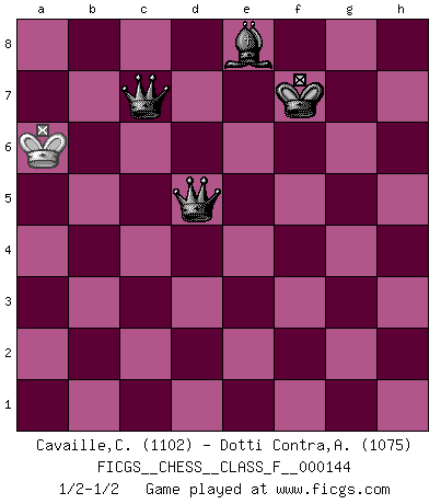 Last move : 1/2-1/2 2014 May 22 20:15:49 [Event "FICGS__CHESS__CLASS_F__000144"] [Site "FICGS"] [Date "2014.03.08"] [Round "1"] [White "Cavaille,Cedric"] [Black "Dotti Contra,Alessandro"] [Result "1/2-1/2"] [WhiteElo "1102"] [BlackElo "1075"] 1.e4 e5 2.Nf3 Nc6 3.d4 Bb4+ 4.c3 Ba5 5.Bb5 exd4 6.Bxc6 dxc6 7.Qxd4 Qxd4 8.Nxd4 Nf6 9.f3 O-O 10.O-O Re8 11.Bg5 Bd7 12.Bxf6 gxf6 13.c4 Bb6 14.Rd1 f5 15.exf5 Bxf5 16.b4 Bxd4+ 17.Rxd4 Re1+ 18.Kf2 Rxb1 19.Rxb1 Bxb1 20.a3 Bc2 21.Rd7 Rc8 22.g4 Bg6 23.f4 f6 24.f5 Bf7 25.c5 b6 26.cxb6 axb6 27.a4 Be8 28.Rd2 c5 29.bxc5 Bxa4 30.cxb6 cxb6 31.Rd6 Rc6 32.Re6 Kf7 33.Rxc6 Bxc6 34.Kg3 b5 35.h4 b4 36.g5 b3 37.Kg4 b2 38.h5 h6 39.gxh6 b1Q 40.h7 Qg1+ 41.Kh4 Qg7 42.h6 Qxh6+ 43.Kg4 Qxh7 44.Kf4 Bd7 45.Kf3 Qxf5+ 46.Ke3 Bb5 47.Kd4 Bc6 48.Kc4 Qd5+ 49.Kc3 Bb5 50.Kb4 f5 51.Kc3 f4 52.Kb4 f3 53.Ka5 f2 54.Kb6 f1Q 55.Kc7 Qc1+ 56.Kb6 Be8 57.Ka6 Qc7 1/2-1/2 Scotch Opening Kingside Castling by player Black (move 9) Kingside Castling by player White (move 10) 10 pieces endgame at move 33 : White KRPPP , Black KBPPP WHITE : King + 1 Rook 3 Pawns BLACK : King + 1 Bishop 3 Pawns 9 pieces endgame at move 33 : White KPPP , Black KBPPP WHITE : King + 3 Pawns BLACK : King + 1 Bishop 3 Pawns 8 pieces endgame at move 39 : White KPPP , Black KBPP WHITE : King + 3 Pawns BLACK : King + 1 Bishop 2 Pawns Promotion Queen by player Black (move 39) 7 pieces endgame at move 42 : White KPP , Black KQBP WHITE : King + 2 Pawns BLACK : King + 1 Queen 1 Bishop 1 Pawn 6 pieces endgame at move 43 : White KP , Black KQBP WHITE : King + 1 Pawn BLACK : King + 1 Queen 1 Bishop 1 Pawn 5 pieces endgame at move 45 : White K , Black KQBP WHITE : King + BLACK : King + 1 Queen 1 Bishop 1 Pawn Promotion Queen by player Black (move 54) This chess game ended in a draw. Follow this game move after move (download)Botvinnik tried to take the mystery out of Chess, always relating it to situations in ordinary life. He used to call Chess a typical inexact problem similar to those which people are always having to solve in everyday life. (Garry Kasparov) Du weisst es gibt ein Problem mit Computern und Fernschach, wenn jeder eine Rating von 2450 hat. (John Christen Knudsen) Aquel que teme a un Peón de Reina aislado, debería de retirarse del Ajedrez. (Siegbert Tarrasch) Assurément je connaissais par expérience le mystérieux attrait de ce jeu royal, le seul entre tous les jeux inventés par les hommes qui échappe souverainement à la tyrannie du hasard, le seul où l'on ne doive sa victoire qu'à son intelligence ou plutôt à une certaine forme d'intelligence. Mais n'est-ce pas déjà le limiter injurieusement que d'appeler les échecs un jeu ? N'est-ce pas une science, un art ou quelque chose qui, comme le cercueil de Mahomet entre ciel et terre, est suspendu entre l'un et l'autre, et qui réunit un nombre incroyable de contraires ? [...] C'est une pensée qui ne mène à rien, une mathématique qui n'établit rien, un art qui ne laisse pas d'uvre, une architecture sans matière; et il l'a prouvé néanmoins qu'il était plus durable, à sa manière, que les livres ou que tout autre monument, ce jeu unique qui appartient à tous les peuples et à tous les temps, et dont personne ne sait quel dieu en fit don à la terre pour tuer l'ennui, pour aiguiser l'esprit et stimuler l'âme. Où commence-t-il, où finit-il ? (Stefan Zweig) The Internet is so big, so powerful and pointless that for some people it is a complete substitute for life. (Andrew Brown)