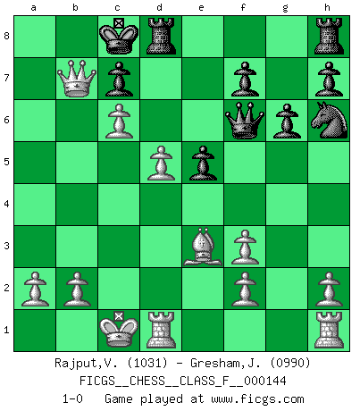Last move : 1-0 2014 April 16 3:58:12 [Event "FICGS__CHESS__CLASS_F__000144"] [Site "FICGS"] [Date "2014.03.08"] [Round "1"] [White "Rajput,Vishalsingh"] [Black "Gresham,Jonathan"] [Result "1-0"] [WhiteElo "1031"] [BlackElo "0990"] 1.e4 Nc6 2.Nf3 d5 3.exd5 Qxd5 4.Na3 Bg4 5.Be2 Ne5 6.c4 Qc6 7.d4 Nxf3+ 8.gxf3 Bh3 9.Be3 O-O-O 10.Qc2 e5 11.d5 Qf6 12.Qa4 a6 13.O-O-O g6 14.c5 Nh6 15.c6 Bxa3 16.Qxa3 Kb8 17.Qb3 b5 18.Bxb5 Bc8 19.Bxa6 Ka8 20.Bb7+ Kb8 21.Bxc8 Kxc8 22.Qb7+ 1-0 KP : Nimzovich defense Queenside Castling by player Black (move 9) Queenside Castling by player White (move 13) Player White won this chess game. Follow this game move after move (download)Spassky will not be psyched out by Fischer. (Mike Goodall) Ich liebe den Moment, wenn ich das Ego meines Gegenüber breche. (Robert James Fischer) En el tablero, la mentira e hipocresía no sobreviven mucho. (Emanuel Lasker) On entre au jeu d'Echecs comme on entre en Religion. Pour le joueur d'Echecs, la partie d'Echecs c'est l'office, la messe, le défilé du 1er Mai, le dépôt de gerbe au Monument aux Morts. C'est un drame sacré. (Michel Roos) Optimism is a variety of information deficit. Sometimes especially true for correspondence chess games. (Michael Aigner)