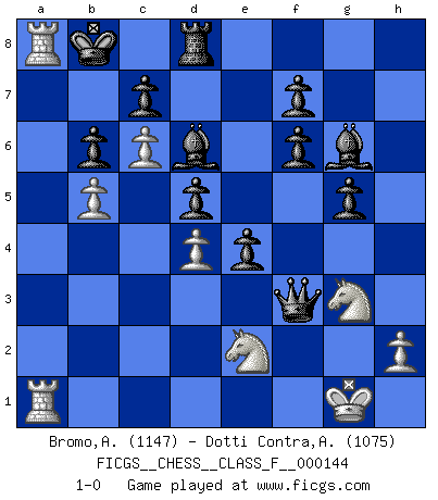 Last move : 1-0 2014 April 16 23:57:18 [Event "FICGS__CHESS__CLASS_F__000144"] [Site "FICGS"] [Date "2014.03.08"] [Round "1"] [White "Bromo,Alexis"] [Black "Dotti Contra,Alessandro"] [Result "1-0"] [WhiteElo "1147"] [BlackElo "1075"] 1.d4 d5 2.c4 Nf6 3.Nc3 Bg4 4.f3 Bh5 5.Bg5 e6 6.e4 h6 7.e5 hxg5 8.c5 Nc6 9.g4 Bg6 10.Bb5 Qd7 11.Nge2 a6 12.Bxc6 Qxc6 13.exf6 gxf6 14.b4 Rh3 15.O-O b6 16.Rc1 e5 17.Re1 Rxf3 18.Ng3 O-O-O 19.a4 e4 20.b5 axb5 21.axb5 Qe6 22.c6 Qxg4 23.Nce2 Bd6 24.Qa4 Ra3 25.Ra1 Rxa4 26.Rxa4 Kb8 27.Rea1 Qf3 28.Ra8+ 1-0 QGD : Marshall defense Kingside Castling by player White (move 15) Queenside Castling by player Black (move 18) Player White won this chess game. Follow this game move after move (download)No other master has such a terrific will to win. At the board he radiates danger, and even the strongest opponents tend to freeze, like rabbits when they smell a panther. Even his weaknesses are dangerous. As white, his opening game is predictable - you can make plans against it - but so strong that your plans almost never work. In the middle game his precision and invention are fabulous, and in the end game you simply cannot beat him. (Anonymous German Expert) Sitze auf Deine Hände. (Siegbert Tarrasch) Un jugador que es sorprendido, esta derrotado a medias. (Proverbio) Comme les marins qui ont mille raisons différentes d'aller en mer, les joueurs d'échecs en ont tout autant avant de s'installer devant une table et jouer... (Vincent Bertignac, philosophe) The difference between perseverance and obstinacy is that one comes from a strong will, and the other from a strong won't. (Henry Ward Beecher)