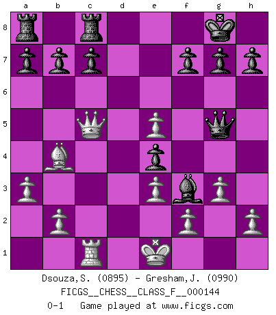 Last move : 0-1 2014 June 27 23:59:38 [Event "FICGS__CHESS__CLASS_F__000144"] [Site "FICGS"] [Date "2014.03.08"] [Round "1"] [White "Dsouza,Stanislaus"] [Black "Gresham,Jonathan"] [Result "0-1"] [WhiteElo "0895"] [BlackElo "0990"] 1.c4 Nf6 2.d4 e6 3.Nc3 Bb4 4.Bd2 d5 5.cxd5 exd5 6.e3 Bf5 7.Nf3 Nbd7 8.a3 Bxc3 9.Bxc3 O-O 10.Bd3 Ne4 11.Bxe4 dxe4 12.Ne5 Nxe5 13.dxe5 Qg5 14.g3 Bg4 15.Qc2 Bf3 16.Rc1 Bxh1 17.Bb4 Rfc8 18.Qc5 Bf3 0-1 This chess game has been lost on time (started : 2014.03.08 21:42:21) English, 1...Nf6 (Anglo-Indian defense) Kingside Castling by player Black (move 9) Player Black won this chess game. Follow this game move after move (download)I look one move ahead... the best ! (Siegbert Tarrasch) Lisa Lane, amerikanische Schachmeisterin, hatte Fischer einmal als stärksten lebenden Spieler bezeichnet. Antwort: Das ist richtig, aber Lisa Lane ist eigentlich nicht in der Lage, das zu beurteilen. (Robert James Fischer) De todos mis libros Rusos, la defensa contiene y difunde el 'calor' mas grande que pudiese verse extraño al observar lo supremamente abstracto que el Ajedrez supuestamente es. (Vladimir Nabokov) Roi des jeux et jeu des rois, les échecs portent en eux un sentiment d'infini. Ils donnent à celui qui s'est efforcé d'en approfondir les arcanes l'impression de n'être pas à la mesure de l'homme; en fait, ils constituent un résumé de l'univers, un microcosme, et figurent cette grande échelle qui, dans les plans de la lumière descend jusqu'à la matière, qui des abîmes insondables remonte jusqu'en l'infini de Dieu. (Pyrame) Programmer - an organism that turns coffee into software. (Anonymous)