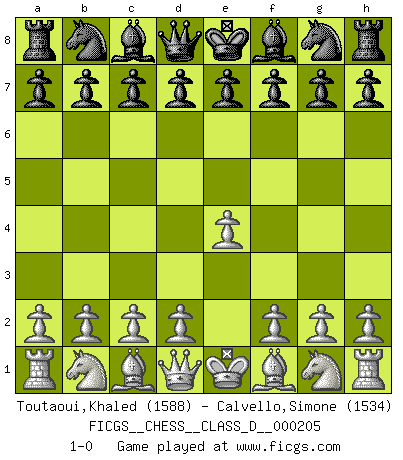 Last move : 1-0 2014 April 21 20:13:2 [Event "FICGS__CHESS__CLASS_D__000205"] [Site "FICGS"] [Date "2014.03.09"] [Round "1"] [White "Toutaoui,Khaled"] [Black "Calvello,Simone"] [Result "1-0"] [WhiteElo "1588"] [BlackElo "1534"] 1.e4 1-0 This chess game has been lost on time (started : 2014.03.09 19:43:4) King's pawn Opening Player White won this chess game. Follow this game move after move (download)That's what Chess is all about. One day you give your opponent a lesson, the next day he gives you one. (Bobby Fischer) Jede Eröffnung ist gut genug um gespielt zu werden, wenn nur ihr Ruf schlecht genug ist. (Savielly Grigorievitsch Tartakower) En el Ajedrez, cuando menos, el valiente hereda la tierra. (Edmar Mednis) Les Echecs sont affaire de jugement sensible. Savoir quand frapper et quand esquiver. (Fischer) The age of a woman doesn't mean a thing. The best tunes are played on the oldest fiddles. (Ralph Waldo Emerson)