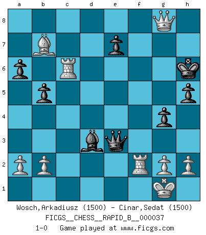 Last move : 1-0 2007 May 4 3:44:12 [Event "FICGS__CHESS__RAPID_B__000037"] [Site "FICGS"] [Date "2007.02.15"] [Round "1"] [White "Wosch,Arkadiusz"] [Black "Cinar,Sedat"] [Result "1-0"] [WhiteElo "1500"] [BlackElo "1500"] 1.e4 c5 2.Nf3 d6 3.d4 cxd4 4.Nxd4 Nf6 5.Nc3 a6 6.Be2 g6 7.O-O Bg7 8.Be3 O-O 9.f4 b5 10.e5 dxe5 11.fxe5 Nd5 12.Nxd5 Qxd5 13.Nf5 Qxe5 14.Bd4 Qc7 15.Bxg7 Bxf5 16.Bxf8 Kxf8 17.Bg4 Bxc2 18.Qd5 f5 19.Qxa8 Kg7 20.Bf3 g5 21.Rac1 g4 22.Bb7 h5 23.Rxf5 Qb6+ 24.Rf2 Bd3 25.Qxb8 Qe3 26.Qf8+ Kg6 27.Qg8+ Kh6 28.Rc6+ 1-0 Comment by player 2 : Sedat Cinar : Thanx for the game :) Sicilian : Najdorf, Opovcensky variation Kingside Castling by player White (move 7) Kingside Castling by player Black (move 8) Player White won this chess game. Follow this game move after move (download)Fischer is completely natural. He plays no roles. He's like a child. Very, very simple. (Zita Rajcsanyi) Schach ist ein Reich, wo sich die menschliche Phantasie frei entfalten kann. (David Bronstein) No todos los artistas son jugadores de Ajedrez, pero todos los jugadores de Ajedrez son artistas. (Marcel Duchamp) La tactique, c'est ce que vous faites quand il y a quelque chose à faire; la stratégie, c'est ce que vous faites quand il n'y a rien à faire. (Savielli Tartacower) Wisdom doesn't necessarily come with age. Sometimes age just shows up all by itself. (Tom Watson)