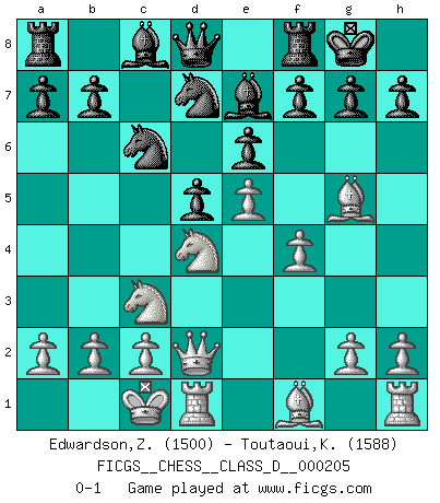 Last move : 0-1 2014 June 17 11:23:19 [Event "FICGS__CHESS__CLASS_D__000205"] [Site "FICGS"] [Date "2014.03.09"] [Round "1"] [White "Edwardson,Zachariah"] [Black "Toutaoui,Khaled"] [Result "0-1"] [WhiteElo "1500"] [BlackElo "1588"] 1.e4 c5 2.Nf3 Nc6 3.d4 cxd4 4.Nxd4 Nf6 5.Nc3 d6 6.Bg5 e6 7.Qd2 Be7 8.O-O-O O-O 9.f4 d5 10.e5 Nd7 0-1 Sicilian defense Queenside Castling by player White (move 8) Kingside Castling by player Black (move 8) Player Black won this chess game. Follow this game move after move (download)Chess is the gymnasium of the mind. (Blaise Pascal) Dass jemand wie Surab Asmaiparaschwili, der selbst Elopunkte gekauft hat , Vize-Präsident der Fide werden konnte, sagt schon einges über den Zustand dieser Organisation aus. (Joel Lautier) Todos los Maestros de Ajedrez fueron un día unos principiantes. (Chernev) L'ordinateur a tué l'originalité. Il n'y a plus guère d'aventures sur l'échiquier. (Jacob Murray) Perhaps the current trend of many chess professionals taking up the more lucrative pastime of poker is not a wholly negative one. It may not be too late for humans to relearn how to take risks in order to innovate and thereby maintain the advanced lifestyles we enjoy. And if it takes a poker-playing supercomputer to remind us that we can't enjoy the rewards without taking the risks, so be it. (The Chess Master and the Computer, by Garry Kasparov - 2010)