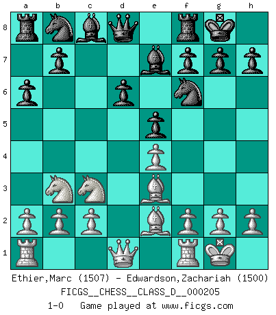 Last move : 1-0 2014 May 6 8:57:21 [Event "FICGS__CHESS__CLASS_D__000205"] [Site "FICGS"] [Date "2014.03.09"] [Round "1"] [White "Ethier,Marc"] [Black "Edwardson,Zachariah"] [Result "1-0"] [WhiteElo "1507"] [BlackElo "1500"] 1.e4 c5 2.Nf3 d6 3.d4 cxd4 4.Nxd4 Nf6 5.Nc3 a6 6.Be2 e5 7.Nb3 Be7 8.O-O O-O 9.Be3 1-0 This chess game has been lost on time (started : 2014.03.09 19:43:4) Sicilian : Najdorf, Opovcensky variation Kingside Castling by player White (move 8) Kingside Castling by player Black (move 8) Player White won this chess game. Follow this game move after move (download)A great player and a great example for many. His book My 60 Memorable Games had a big impact on me. It is a shame he didn't continue to enrich the world of chess with his unparalleled understanding after 1972. (Jan Timman, about Bobby Fischer's death) Schach ist ein Teil der Kultur, und wenn es mit der Kultur abwärts geht, geht es auch mit dem Schach abwärts. (Mikhail Moiseyevich Botvinik) La vida es como el Ajedrez, con lucha, competición y eventos buenos y malos. (Benjamin Franklin) Nous sommes les pions de la mystérieuse partie d'Echecs jouée par Dieu. Il nous déplace, nous arrête, nous pousse encore, puis nous lance un à un dans la boîte du Néant. Epitaphe sur la tombe de David Janowsky (1868-1927). The bottom line is always the bottom line. (Johann Piek)