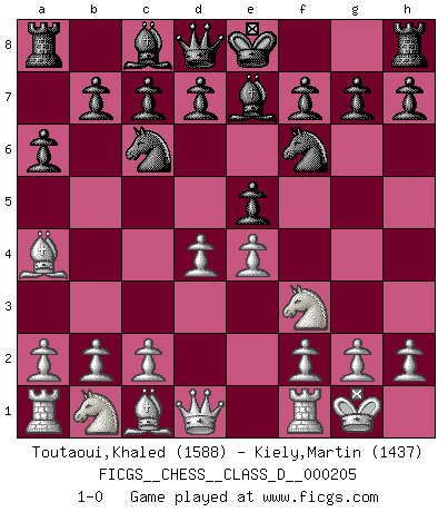 Last move : 1-0 2014 April 28 8:33:34 [Event "FICGS__CHESS__CLASS_D__000205"] [Site "FICGS"] [Date "2014.03.09"] [Round "1"] [White "Toutaoui,Khaled"] [Black "Kiely,Martin"] [Result "1-0"] [WhiteElo "1588"] [BlackElo "1437"] 1.e4 e5 2.Nf3 Nc6 3.Bb5 a6 4.Ba4 Nf6 5.O-O Be7 6.d4 1-0 This chess game has been lost on time (started : 2014.03.09 19:43:4) Ruy Lopez : Closed, centre attack Kingside Castling by player White (move 5) Player White won this chess game. Follow this game move after move (download)It is difficult to play against Einstein's theory --on his first loss to Fischer. (Mikhail Tal) Garry Kasparov war erst in der Großmeister-Organisation GMA, dann in der Profischach-Vereinigung PCA, zum Schluss kehrte er wieder in den Schoß der FIDE zurück. Aber gut, manche Leute sind flexibel (Viswanathan Anand) Repentinamente, me resultaba obvio en mi analisis que yo había pasado por alto lo que Fischer había visto en el tablero con la mas grande facilidad. (Mikhail Botvinnik) Ce n'est pas pour s'amuser qu'il joue aux échecs : il célèbre un culte. (Vladimir Nabokov) A shortcut is the longest distance between two points. (Don Groves)