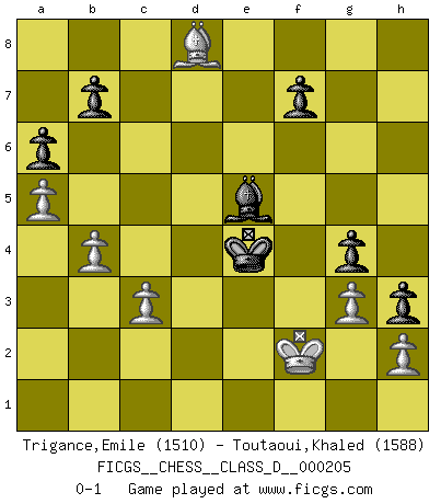 Last move : 0-1 2014 June 5 7:51:9 [Event "FICGS__CHESS__CLASS_D__000205"] [Site "FICGS"] [Date "2014.03.09"] [Round "1"] [White "Trigance,Emile"] [Black "Toutaoui,Khaled"] [Result "0-1"] [WhiteElo "1510"] [BlackElo "1588"] 1.e4 c5 2.Nf3 Nc6 3.d4 cxd4 4.Nxd4 Nf6 5.Nc3 d6 6.Bc4 Qb6 7.Nb3 e6 8.O-O a6 9.a4 Be7 10.a5 Qc7 11.Be2 O-O 12.Be3 Nd7 13.Na4 Rb8 14.Qd2 Nf6 15.Bb6 Qd7 16.Nc3 d5 17.exd5 Nxd5 18.Nxd5 Qxd5 19.Qxd5 exd5 20.Rfd1 Bf5 21.Bd3 Bxd3 22.Rxd3 Nb4 23.Rd2 Bg5 24.Re2 Rfe8 25.Rae1 Rxe2 26.Rxe2 Nc6 27.g3 Bf6 28.c3 g5 29.Rd2 Re8 30.Kf1 Kg7 31.Rxd5 g4 32.Nc5 Re7 33.Nd3 Re4 34.Nc5 Re7 35.Nd3 Ne5 36.Nxe5 Rxe5 37.Rxe5 Bxe5 38.Bd4 Kf6 39.Ke2 Kf5 40.Ke3 Bd6 41.Kd3 h5 42.Ke3 h4 43.f4 h3 44.b4 Bxf4+ 45.Kf2 Bd6 46.Bb6 Ke4 47.Bd8 Be5 0-1 Sicilian defense Kingside Castling by player White (move 8) Kingside Castling by player Black (move 11) Player Black won this chess game. Follow this game move after move (download)Robert Fischer is a law unto himself. (Larry Evans) Man gibt nur Pakete auf. (Paul Keres) Antes de los Finales, los dioses han colocado el Juego Medio. (Siegbert Tarrasch) Shah mat. Le roi est mort. Cri de fierté d'un joueur venant de terrasser son adversaire, courtoisement, sans effusion de sang. Beep ! (R2D2 in Star Wars ep.3)