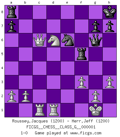 Last move : 1-0 2006 June 27 23:23:33 [Event "FICGS__CHESS__CLASS_G__000001"] [Site "FICGS"] [Date "2006.05.25"] [Round "1"] [White "Roussey,Jacques"] [Black "Herr,Jeff"] [Result "1-0"] [WhiteElo "1200"] [BlackElo "1200"] 1.e4 e5 2.Nf3 Nc6 3.d4 exd4 4.Bc4 d6 5.c3 dxc3 6.Nxc3 Bg4 7.h3 Bh5 8.Qd5 Nf6 9.Qd3 Bxf3 10.Qxf3 Ne5 11.Qe2 Nxc4 12.Qxc4 Qd7 13.Bg5 Be7 14.O-O O-O 15.Rad1 Ne8 16.Bxe7 Qxe7 17.Nd5 Qd8 18.Rc1 c6 19.Ne3 Nc7 20.Rfd1 Qe7 21.f3 Kh8 22.Nf5 Qg5 23.Nxd6 Qg6 24.Nxb7 f5 25.exf5 Rxf5 26.Qxc6 Ne6 27.Nd6 1-0 Scotch gambit Kingside Castling by player White (move 14) Kingside Castling by player Black (move 14) Player White won this chess game. Follow this game move after move (download)When you play Bobby, it is not a question if you win or lose. It is a question if you survive. (Boris Spassky) Um sich vor der Gefahr einer Erkältung zu schützen, sorge der wanderlustige König beizeiten für ein brauchbares Versteck. (Aaron Nimzowitsch) El Ajedrez no es una pizca de inferior al violín, y tenemos un gran número de violinistas profesionales. (Mikhail Botvinnik) Le système Elo représente seulement une moyenne. Il est simplement un indicateur de votre stabilité. (Anatoli Karpov) When you've done things right people won't know you've done anything at all. (Futurama)