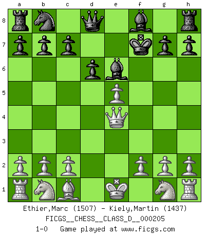 Last move : 1-0 2014 April 25 8:20:54 [Event "FICGS__CHESS__CLASS_D__000205"] [Site "FICGS"] [Date "2014.03.09"] [Round "1"] [White "Ethier,Marc"] [Black "Kiely,Martin"] [Result "1-0"] [WhiteElo "1507"] [BlackElo "1437"] 1.e4 e5 2.Bc4 Nf6 3.d4 d6 4.dxe5 Nxe4 5.Bxf7+ Kxf7 6.Qd5+ Be6 7.Qxe4 1-0 This chess game has been lost on time (started : 2014.03.09 19:43:4) Bishop's Opening : Ponziani gambit Player White won this chess game. Follow this game move after move (download)Chess teaches you to control the initial excitement you feel when you see something that looks good and it trains you to think objectively when you're in trouble. (Stanley Kubrick) Der Freibauer hat für mich eine Seele, genau wie der Mensch, Wünsche, die unerkannt in ihm schlummern, und Befürchtungen, von deren Existenz er selbst kaum ahnt. (Aaron Nimzowitsch) No puedes jugar al Ajedrez si eres de corazón noble. (Proverbio Francés) Aidez vos pièces, elles vous aideront. (Paul Morphy) A good programmer is someone who always looks both ways before crossing a one-way street. (Doug Linder)