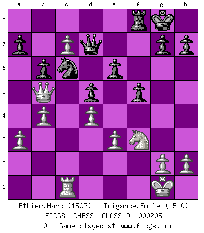 Last move : 1-0 2014 June 1 9:27:50 [Event "FICGS__CHESS__CLASS_D__000205"] [Site "FICGS"] [Date "2014.03.09"] [Round "1"] [White "Ethier,Marc"] [Black "Trigance,Emile"] [Result "1-0"] [WhiteElo "1507"] [BlackElo "1510"] 1.e4 e6 2.d4 d5 3.e5 c5 4.c3 Nc6 5.Nf3 Qb6 6.a3 Nh6 7.b4 cxd4 8.cxd4 Nf5 9.Be3 Nxe3 10.fxe3 Be7 11.Bd3 Bd7 12.Nc3 Rc8 13.Na4 Qd8 14.O-O b6 15.Rc1 O-O 16.Nc3 f5 17.Ba6 Rb8 18.Qe2 Qe8 19.Nb5 Qd8 20.Rc2 Bc8 21.Bxc8 Rxc8 22.Rfc1 Qd7 23.Nd6 Bxd6 24.exd6 Nb8 25.Rc7 Rxc7 26.dxc7 Nc6 27.Qb5 1-0 French : Advance, Paulsen attack Kingside Castling by player White (move 14) Kingside Castling by player Black (move 15) Player White won this chess game. Follow this game move after move (download)Chess is a terrible game. If you have no center, your opponent has a freer position. If you do have a center, then you really have something to worry about ! (Siegbert Tarrasch) Ein guter Spieler hat immer Glück. (José Raúl Capablanca) El Ajedrez es una hermosa aventura. (Bent Larsen) Aux échecs, les retours au sommet sont rares : les dommages psychologiques consécutifs à une défaite sont trop sévères. (Daily Telegraph) See no evil, hear no evil, speak no evil. (The 3 monkeys)