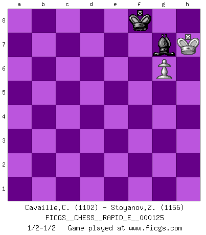 Last move : 1/2-1/2 2014 March 19 20:20:7 [Event "FICGS__CHESS__RAPID_E__000125"] [Site "FICGS"] [Date "2014.03.11"] [Round "1"] [White "Cavaille,Cedric"] [Black "Stoyanov,Zdravko"] [Result "1/2-1/2"] [WhiteElo "1102"] [BlackElo "1156"] 1.e4 c5 2.Nf3 a6 3.d4 cxd4 4.Nxd4 e5 5.Nf3 d6 6.Bc4 h6 7.O-O Bg4 8.h3 Bh5 9.a3 Nf6 10.Bd3 d5 11.Qe2 Bxf3 12.Qxf3 Nc6 13.c3 d4 14.b4 dxc3 15.Nxc3 Nd4 16.Qd1 Rc8 17.Be3 Rxc3 18.Bxd4 Qxd4 19.Bc2 Qxd1 20.Bxd1 Be7 21.f3 O-O 22.Be2 Re3 23.Kf2 Rc3 24.Rfc1 Rfc8 25.Rxc3 Rxc3 26.g4 Nd7 27.Kg3 Nb6 28.b5 axb5 29.Rb1 Bxa3 30.Rxb5 Bc5 31.h4 Bd4 32.h5 Be3 33.Rxe5 g5 34.Re7 Bf4+ 35.Kg2 Re3 36.Kf1 Nd5 37.Rxb7 Nc3 38.Rb2 Be5 39.Rc2 Nb1 40.Rc6 Nd2+ 41.Ke1 Bc3 42.Rxh6 Nxe4 43.Kd1 Ng3 44.Bc4 Rxf3 45.Rc6 Ne4 46.Rc7 Nf2+ 47.Ke2 Rf6 48.Rxf7 Rxf7 49.Bxf7+ Kxf7 50.Kxf2 Kf6 51.Ke3 Be5 52.Ke4 Ke6 53.h6 Bf6 54.h7 Be5 55.Ke3 Kf7 56.Ke4 Ba1 57.Kf5 Bf6 58.h8Q Bxh8 59.Kxg5 Ba1 60.Kh6 Bb2 61.g5 Bc3 62.Kh7 Ba1 63.g6+ Kf8 64.Kh6 Bh8 65.Kh7 Bg7 1/2-1/2 Sicilian : O'Kelly variation Kingside Castling by player White (move 7) Kingside Castling by player Black (move 21) 10 pieces endgame at move 48 : White KRBPP , Black KRBNP WHITE : King + 1 Rook 1 Bishop 2 Pawns BLACK : King + 1 Rook 1 Bishop 1 Knight 1 Pawn 9 pieces endgame at move 48 : White KBPP , Black KRBNP WHITE : King + 1 Bishop 2 Pawns BLACK : King + 1 Rook 1 Bishop 1 Knight 1 Pawn 8 pieces endgame at move 49 : White KBPP , Black KBNP WHITE : King + 1 Bishop 2 Pawns BLACK : King + 1 Bishop 1 Knight 1 Pawn 7 pieces endgame at move 49 : White KPP , Black KBNP WHITE : King + 2 Pawns BLACK : King + 1 Bishop 1 Knight 1 Pawn 6 pieces endgame at move 50 : White KPP , Black KBP WHITE : King + 2 Pawns BLACK : King + 1 Bishop 1 Pawn Promotion Queen by player White (move 58) 5 pieces endgame at move 58 : White KP , Black KBP WHITE : King + 1 Pawn BLACK : King + 1 Bishop 1 Pawn 4 pieces endgame at move 59 : White KP , Black KB WHITE : King + 1 Pawn BLACK : King + 1 Bishop This chess game ended in a draw. Follow this game move after move (download)Discovered check is the dive bomber of the Chessboard. (Reuben Fine) Wenn Spassky eine Figur opfert kannst du genauso gut aufgeben. Aber wenn Tal eine Figur opfert, spiel weiter. Er könnte noch eine weitere opfern, und dann ... wer weiß? (Miguel Najdorf) La batalla por la última verdad nunca sera ganada. Y es por eso que el Ajedrez es tan fascinante. (Hans Kmoch) Lorsque vous vous retrouvez devant une position atroce, ne tendez pas un ultime piège dérisoire avec l'intention d'abandonner si l'adversaire le déjoue ! Faites-vous plutôt un devoir de résister comme si votre vie en dépendait. Jouez le coup qui vous déplairait au centuple si vous étiez dans la peau de votre tortionnaire ! Luck has a peculiar habit of favoring those who don't depend on it. (Author unknown)
