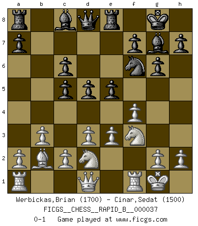 Last move : 0-1 2007 April 20 23:54:24 [Event "FICGS__CHESS__RAPID_B__000037"] [Site "FICGS"] [Date "2007.02.15"] [Round "1"] [White "Werbickas,Brian"] [Black "Cinar,Sedat"] [Result "0-1"] [WhiteElo "1700"] [BlackElo "1500"] 1.f4 d5 2.Nf3 c5 3.e3 Nc6 4.Bb5 Nf6 5.b3 g6 6.O-O Bg7 7.Bb2 O-O 8.Bxc6 bxc6 9.d3 Re8 10.Nbd2 e5 0-1 This chess game has been lost on time (started : 2007.02.15 9:27:51) Bird's Opening Kingside Castling by player White (move 6) Kingside Castling by player Black (move 7) Player Black won this chess game. Follow this game move after move (download)There are two classes of men; those who are content to yield to circumstances and who play whist; those who aim to control circumstances, and who play Chess. (Mortimer Collins) Woher wissen wir, daß der Neanderthaler Blindschach gespielt hat? -- Bei Ausgrabungen wurden keine Schachbretter und Figuren gefunden. (Anonymous) Una buena ofensiva y una buena defensa, comienzan ambas con un buen desarrollo. (Bruce A. Moon) Le génie consiste à savoir transgresser les règles au moment opportun. (Teichmann) Industry executives and analysts often mistakenly talk about strategy as if it were some kind of chess match. But in chess, you have just two opponents, each with identical resources, and with luck playing a minimal role. The real world is much more like a poker game, with multiple players trying to make the best of whatever hand fortune has dealt them. In our industry, Bill Gates owns the table until someone proves otherwise. (David Moschella, 'Computerworld')