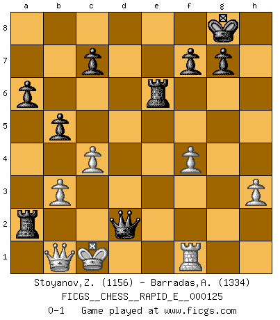 Last move : 0-1 2014 March 14 21:21:57 [Event "FICGS__CHESS__RAPID_E__000125"] [Site "FICGS"] [Date "2014.03.11"] [Round "1"] [White "Stoyanov,Zdravko"] [Black "Barradas,Anderson"] [Result "0-1"] [WhiteElo "1156"] [BlackElo "1334"] 1.e4 e5 2.Nf3 Nf6 3.d3 d6 4.c3 Bg4 5.h3 Bh5 6.Be2 h6 7.Be3 Nbd7 8.Qa4 a6 9.d4 b5 10.Qd1 Nxe4 11.Nbd2 Nxd2 12.Qxd2 Nf6 13.O-O Be7 14.Rad1 Ne4 15.Qc1 Bf6 16.Qb1 Ng5 17.Bxg5 Bxg5 18.Rfe1 Qf6 19.dxe5 dxe5 20.Qe4 O-O 21.Bd3 Bg6 22.Qxe5 Qc6 23.Nxg5 hxg5 24.Qxg5 Rae8 25.Be2 Be4 26.f3 Bc2 27.Rc1 Bg6 28.b3 Qb6+ 29.Kf1 Qd6 30.Rcd1 Qh2 31.Kf2 Re6 32.f4 Rf6 33.Kf3 Bh5+ 34.Ke3 Re8+ 35.Kd2 Bxe2 36.Rxe2 Rd6+ 37.Kc1 Rxe2 38.Rf1 Rxg2 39.Qf5 Re6 40.c4 Rxa2 41.Qb1 Qd2+ 0-1 Petrov's defense Kingside Castling by player White (move 13) Kingside Castling by player Black (move 20) Player Black won this chess game. Follow this game move after move (download)All I want to do, ever, is just play Chess. (Bobby Fischer) Es ist wirklich schade, dass so viele Schachspieler nicht auf ihr Äußeres achten! (Alexandra Kosteniuk) El Ajedrez es una manera fabulosa para que los niños aprendan a autovalorarse y a autoestimarse. (Saudin Robovic) En blitz, le Cavalier l'emporte sur le Fou. (Vlastimil Hort) Success without honor is an unseasoned dish; it will satisfy your hunger, but it won't taste good. (Joe Paterno)
