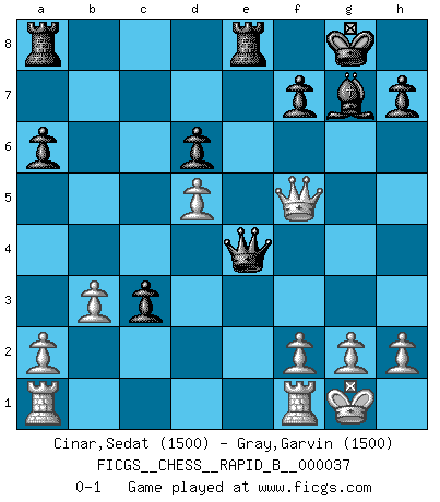 Last move : 0-1 2007 May 20 10:12:1 [Event "FICGS__CHESS__RAPID_B__000037"] [Site "FICGS"] [Date "2007.02.15"] [Round "1"] [White "Cinar,Sedat"] [Black "Gray,Garvin"] [Result "0-1"] [WhiteElo "1500"] [BlackElo "1500"] 1.e4 c5 2.Nf3 Nc6 3.d4 cxd4 4.Nxd4 Nf6 5.Nc3 e5 6.Ndb5 d6 7.Bg5 a6 8.Na3 b5 9.Bxf6 gxf6 10.Nd5 f5 11.Bd3 Be6 12.c3 Bg7 13.Nc2 Bxd5 14.exd5 Ne7 15.Ne3 e4 16.Bc2 O-O 17.Qh5 b4 18.Nxf5 Nxf5 19.Qxf5 bxc3 20.Bxe4 Qh4 21.b3 Rfe8 22.O-O Qxe4 0-1 This chess game has been lost on time (started : 2007.02.15 9:27:51) Sicilian : Pelikan (Lasker/Sveshnikov) variation Kingside Castling by player Black (move 16) Kingside Castling by player White (move 22) Player Black won this chess game. Follow this game move after move (download)Though most people love to look at the games of the great attacking masters, some of the most successful players in history have been the quiet positional players. They slowly grind you down by taking away your space, tying up your pieces, and leaving you with virtually nothing to do ! (Yasser Seirawan) Bis jetzt ist Weiß einer wohlbekannten Analyse gefolgt. Aber jetzt begeht er einen schrecklichen Fehler: Er beginnt seinen eigenen Kopf zu benutzen. (Siegbert Tarrasch) El Ajedrez es tan inspirador que yo no creo que un buen jugador sea capaz de tener un pensamiento malo durante una partida. (Wilhelm Steinitz) On n'a jamais que l'âge auquel on a commence à jouer aux échecs car après on cesse de vieillir. (Capablanca) The Internet is the world's largest library. It's just that all the books are on the floor. (John Allen Paulos)