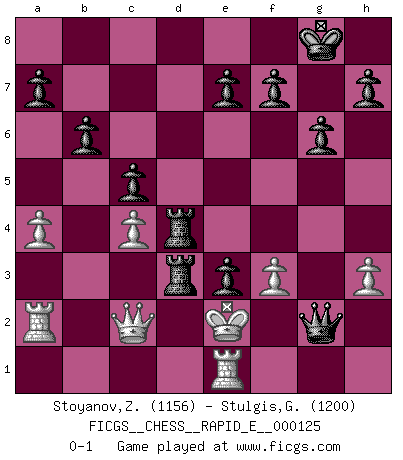 Last move : 0-1 2014 March 18 17:10:57 [Event "FICGS__CHESS__RAPID_E__000125"] [Site "FICGS"] [Date "2014.03.11"] [Round "1"] [White "Stoyanov,Zdravko"] [Black "Stulgis,Gintautas"] [Result "0-1"] [WhiteElo "1156"] [BlackElo "1200"] 1.e4 c5 2.Nf3 g6 3.h3 Bg7 4.a3 Nc6 5.Bb5 Nf6 6.Bxc6 dxc6 7.d3 O-O 8.O-O Nd7 9.Re1 Qc7 10.Be3 Bxb2 11.Ra2 Bg7 12.c3 b6 13.Qd2 Ne5 14.Nxe5 Bxe5 15.Kf1 Be6 16.c4 Rad8 17.Nc3 Bxc4 18.Nd5 cxd5 19.dxc4 dxe4 20.Qc2 Rd3 21.Qe2 Rfd8 22.a4 Bc3 23.Rc1 Qh2 24.f3 Bd4 25.Bxd4 R8xd4 26.Re1 e3 27.Qc2 Qh1+ 28.Ke2 Qxg2+ 0-1 Sicilian : Hungarian variation Kingside Castling by player Black (move 7) Kingside Castling by player White (move 8) Player Black won this chess game. Follow this game move after move (download)First-class players lose to second class players because second-class players sometimes play a first-class game. (Tarrasch) Je mehr wir mit Computern analysieren, desto mehr glauben wir an Verteidigung. (Vladimir Kramnik) Los problemas de Ajedrez exigen del compositor las mismas virtudes que caracterizan todo el arte de valor: originalidad, invención, concisión, armonía, complejidad e insinceridad explendida. (Vladimir Nabokov) Les Echecs sont affaire de jugement sensible. Savoir quand frapper et quand esquiver. (Fischer) Somehow our devils are never quite what we expect when we meet them face to face. (Nelson DeMille)