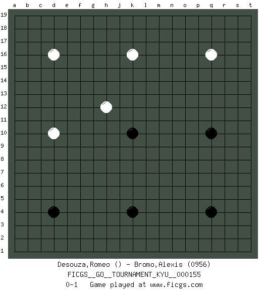 Last move : 0-1 2014 April 18 20:3:43 [Event "FICGS__GO__TOURNAMENT_KYU__000155"] [Site "FICGS"] [Date "2014.03.12"] [Round "1"] [Black "Desouza,Romeo"] [White "Bromo,Alexis"] [Result "0-1"] [Rating 2 "0956"] 1.d4 q16 2.q4 d16 3.k10 d10 4.q10 k16 5.k4 h12 0-1 This go game has been lost on time (started : 2014.03.12 20:59:2) Here are the names of the openings (joseki) played in the four corners : Player White won this Go (weiqi, baduk) game. Follow this game move after move (download)In the opening, when you don't know what to play, make a shimari. (Jansteen) You cannot beat a roulette table unless you steal money from it. (Albert Einstein)