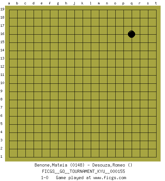 Last move : 1-0 2014 April 26 8:20:21 [Event "FICGS__GO__TOURNAMENT_KYU__000155"] [Site "FICGS"] [Date "2014.03.12"] [Round "1"] [Black "Benone,Mateia"] [White "Desouza,Romeo"] [Result "1-0"] [Rating 1 "0148"] 1.q16 1-0 This go game has been lost on time (started : 2014.03.12 20:59:2) Here are the names of the openings (joseki) played in the four corners : Player Black won this Go (weiqi, baduk) game. Follow this game move after move (download)Learning josekis by heart is useless if you don't try departing from them. (Pierre Audouard) I take risks, sometimes patients die, but not taking risks causes more patients to die. So I guess my biggest problem is I've been cursed with the ability to do the math. (Gregory House, House M.D.)