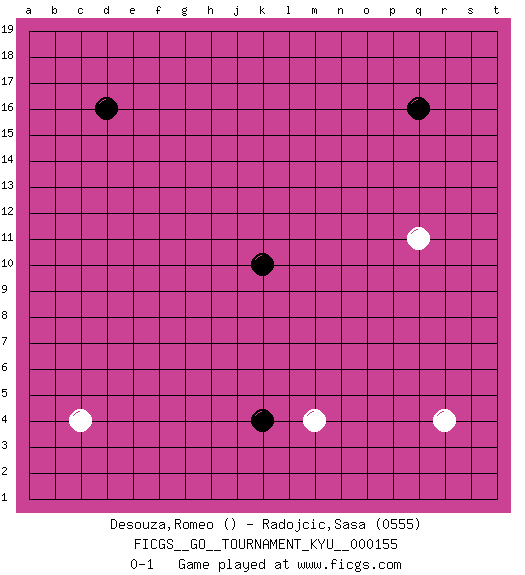 Last move : 0-1 2014 April 17 7:53:35 [Event "FICGS__GO__TOURNAMENT_KYU__000155"] [Site "FICGS"] [Date "2014.03.12"] [Round "1"] [Black "Desouza,Romeo"] [White "Radojcic,Sasa"] [Result "0-1"] [Rating 2 "0555"] 1.d16 c4 2.q16 r4 3.k10 q11 4.k4 m4 0-1 This go game has been lost on time (started : 2014.03.12 20:59:2) Here are the names of the openings (joseki) played in the four corners : Corner q16 : q16 q11 Hoshi (Hwajeom, Seongjeom, Xingwei`) 4-4 Point. The star or hoshi (4-4) point, emphasizing influence at the potential expense of territory. Player White won this Go (weiqi, baduk) game. Follow this game move after move (download)When your opponent is thick, you must also become thick. (Otake Hideo, 9p) Gambling is the son of avarice and the father of despair. (French proverb)