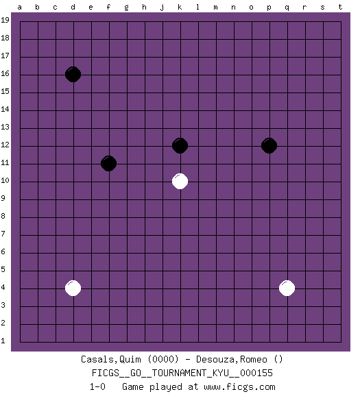 Last move : 1-0 2014 April 19 20:8:33 [Event "FICGS__GO__TOURNAMENT_KYU__000155"] [Site "FICGS"] [Date "2014.03.12"] [Round "1"] [Black "Casals,Quim"] [White "Desouza,Romeo"] [Result "1-0"] [Rating 1 "0000"] 1.d16 q4 2.f11 d4 3.p12 k10 4.k12 1-0 This go game has been lost on time (started : 2014.03.12 20:59:2) Here are the names of the openings (joseki) played in the four corners : Player Black won this Go (weiqi, baduk) game. Follow this game move after move (download)White is always trying to kill a bigger group than black is trying to save. (Anonymous) Heh, heh, heh. Time to abandon ship. (General Grievous in Star Wars ep.3)